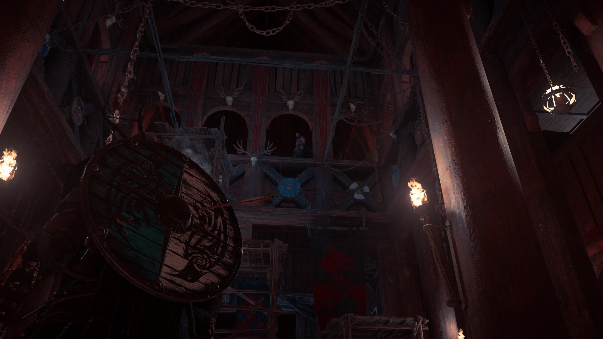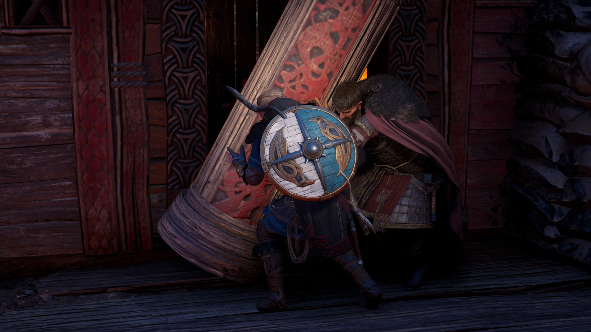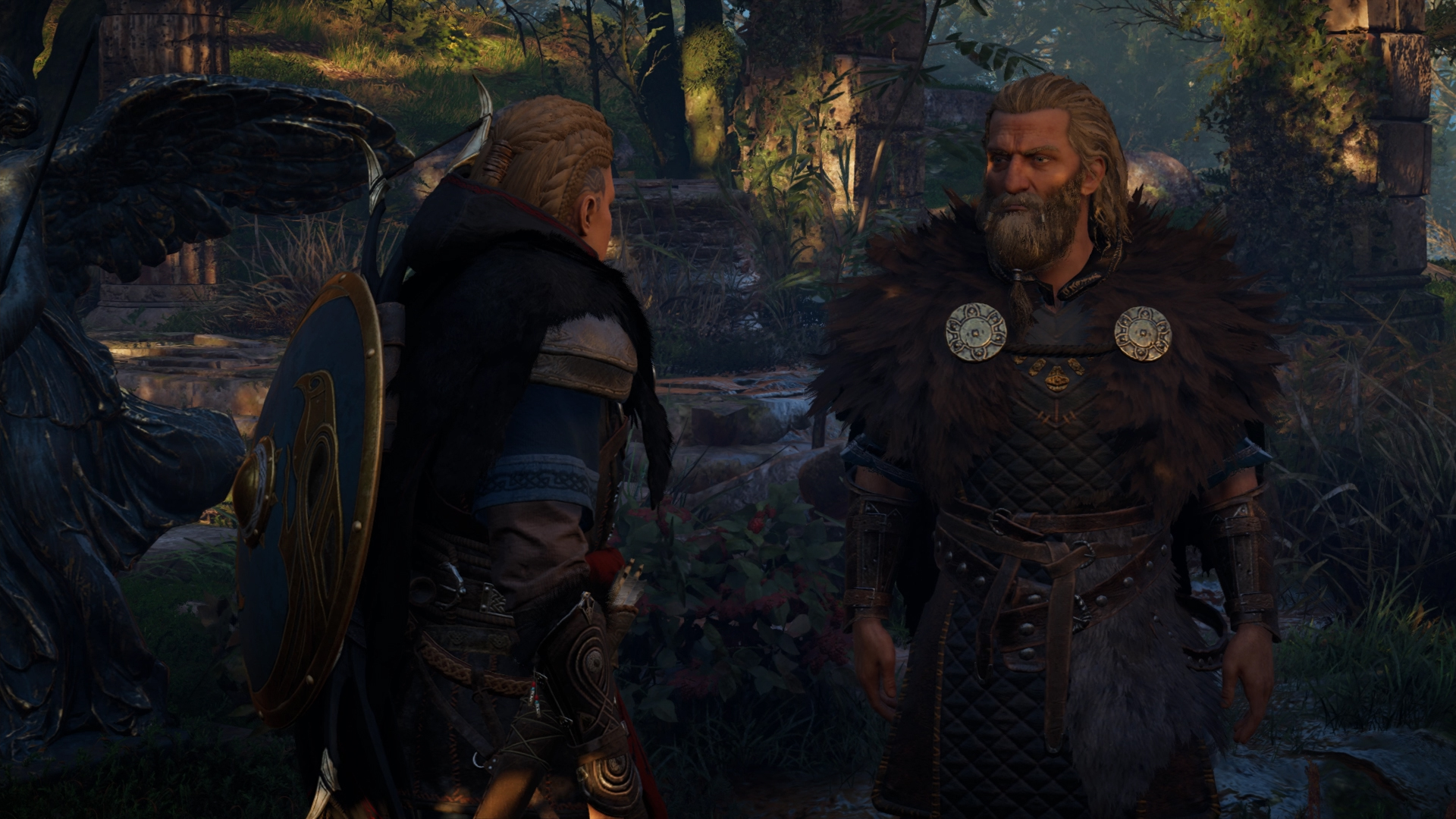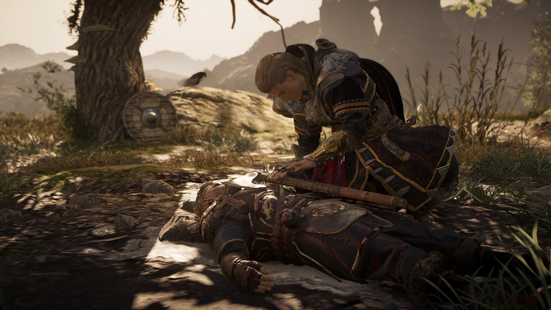 However, Eivor managed to free herself and met Dag, who had also escaped and was confronting a group of enemy soldiers. After the two killed the warriors, Dag handed her the Raven Clan Shield from a fallen soldier and parted ways with Eivor, heading off to the beach to reclaim the longship, the Sea-Chariot, while Eivor headed towards Avaldsnes, where Kjotve departed from. Within the settlement's longhouse, one of Kjotve's men, Rikiwulf, was in the middle of interrogating Bragi, the skald of Eivor's crew. After a quick battle, Eivor defeated and killed Kjotve's follower, and freed his friend. Recovering her father's axe, Eivor had a strange vision featuring a cloaked man with a grey beard, a monstrous wolf and a titanic tree on the horizon. Brought back to reality, she and the other Vikings then eliminated the remaining number of Kjotve's men to take back their longship. Having reclaimed their ship, Eivor and her crew set sail and returned home to Fornburg.[8]