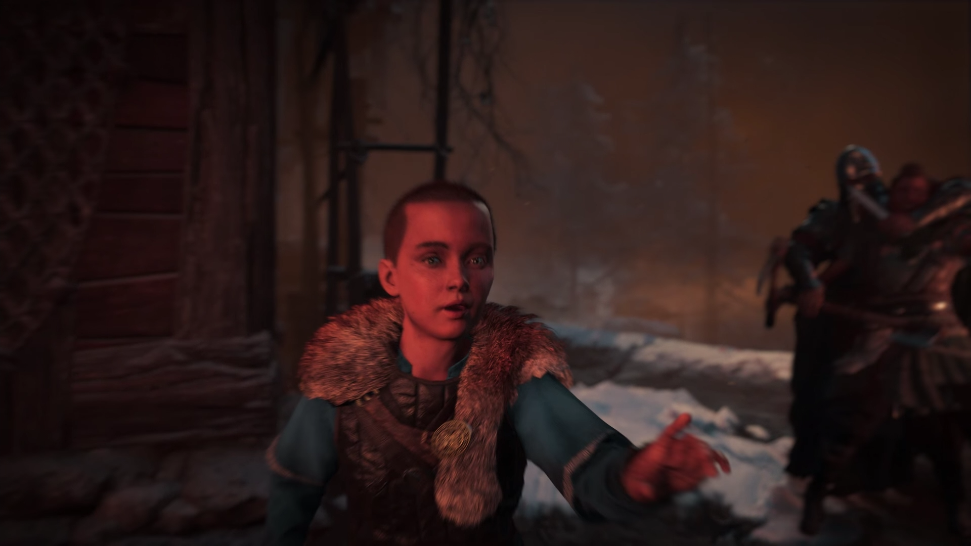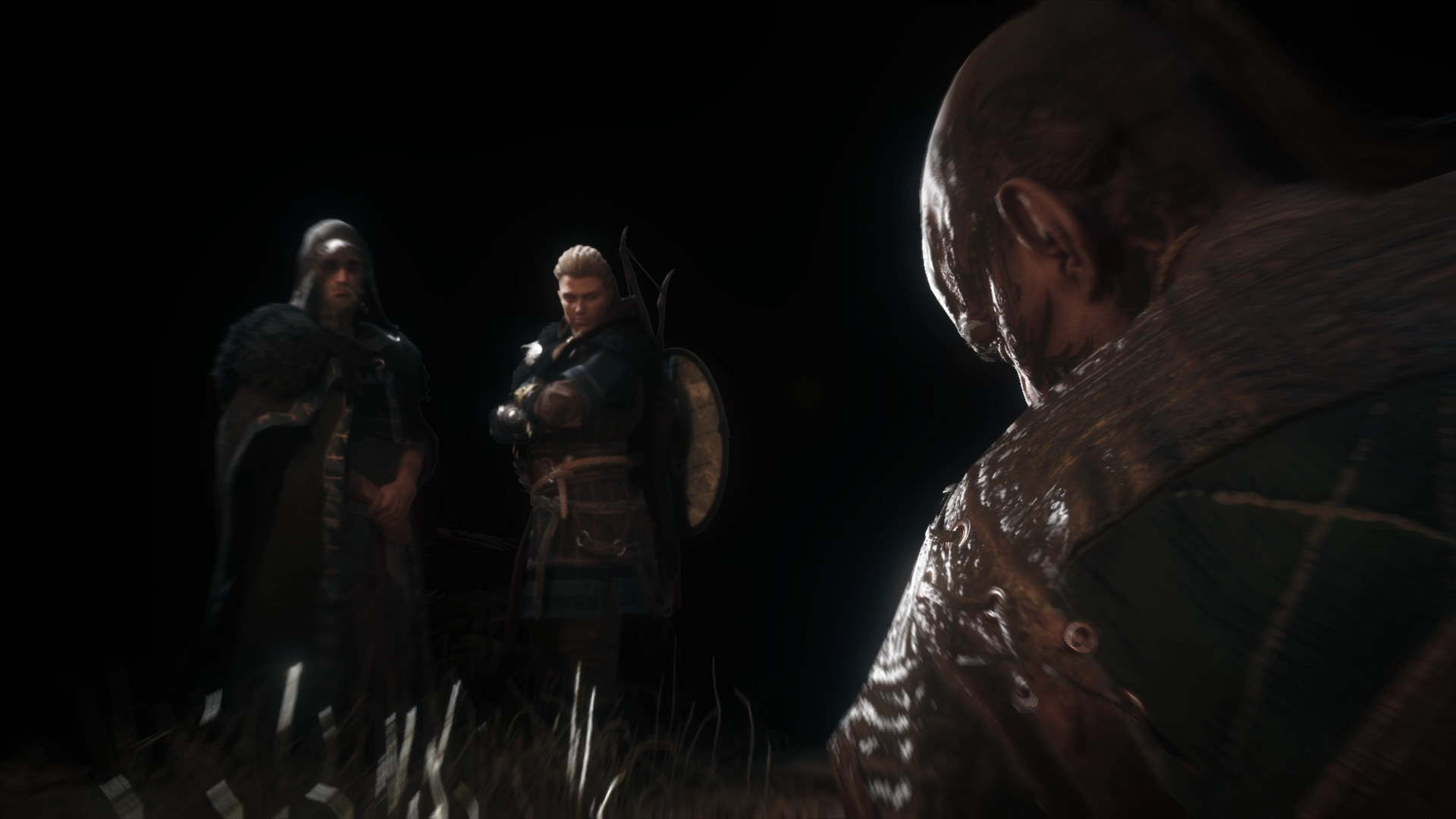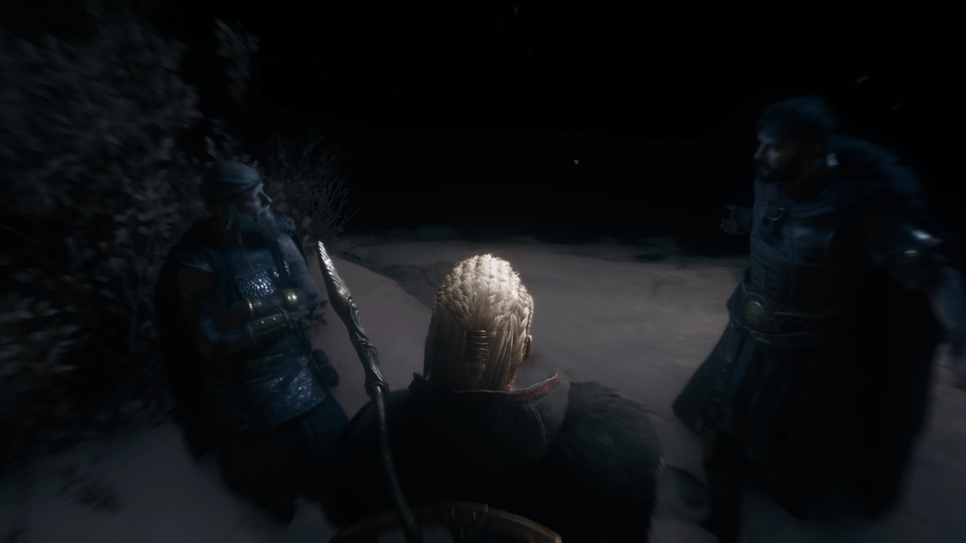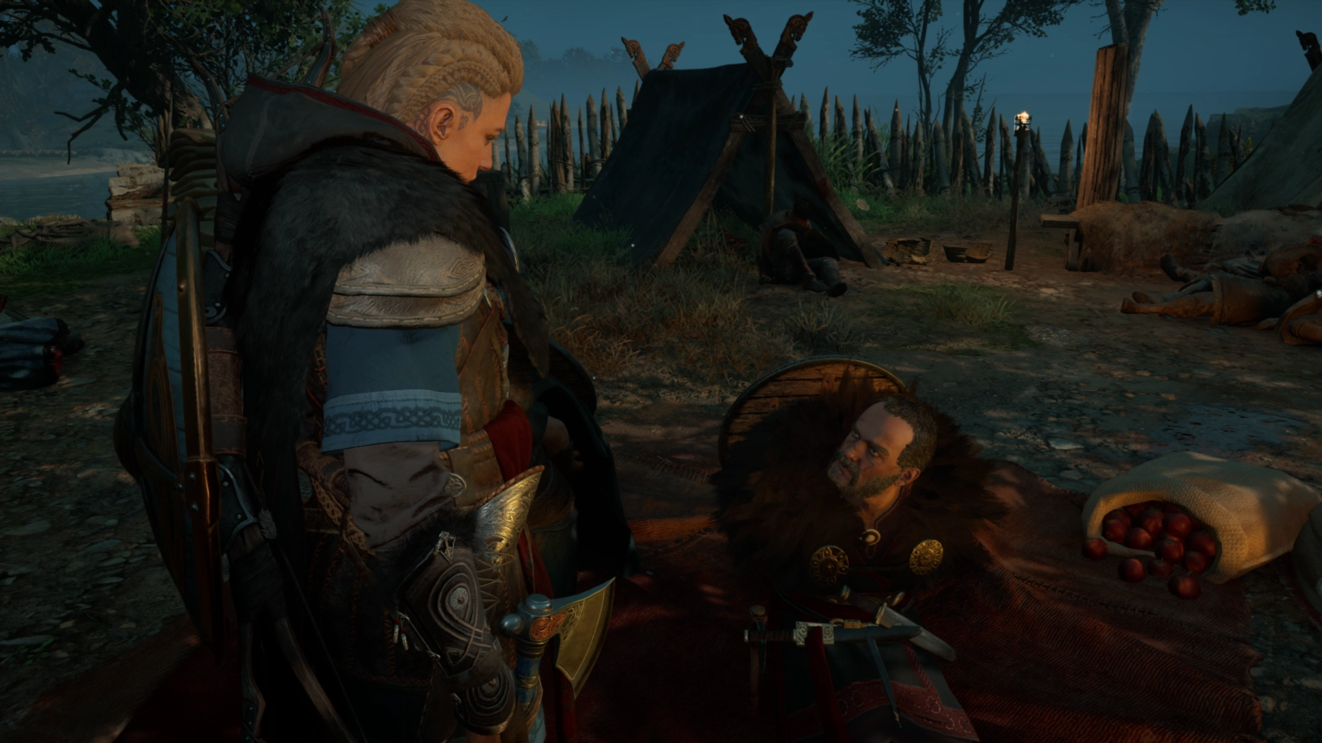 Following her brief training with the Hidden Blade and her talk with Sigurd, Eivor went to sleep and dreamed about the prophecies told by Valka. After a restless sleep, she woke up, having been disturbed by a sound outside her hamlet. She went outside, finding one of Kjotve's spies running off. Eivor chased after the spy and killed him before he could escape. She then tracked down and killed his two associates.[22]