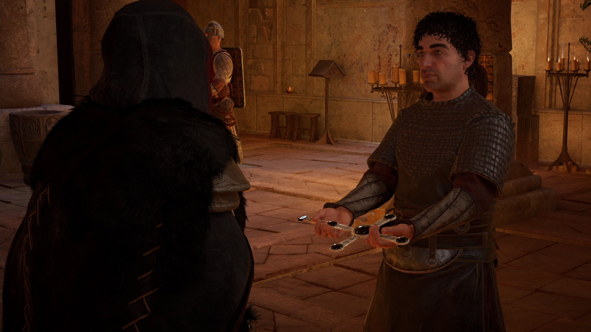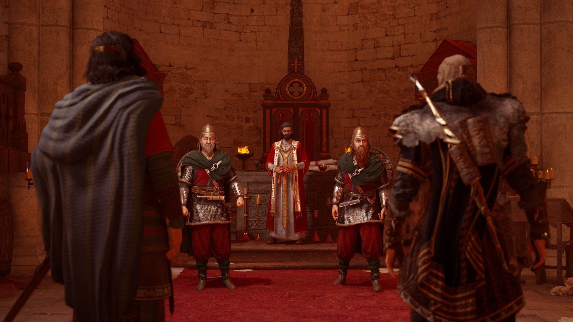 Around the same time, Eivor was summoned by King Alfred, who had left the swamplands to resume his duty as King of Wessex. The jarlskona traveled to Wincestre and stepped into courtyard of The Old Minster, where she drew the attention of the king's guards, though Alfred promptly calmed them and welcomed her in to discuss the near completion of a treaty with Athelstan. As she was one of the greatest lords of England, he offered Eivor the option of becoming the lord of all lands northeast of her settlement. Knowing the offer to be too good to be true, Eivor asked what she had to do in exchange, to which Alfred requested for her to convert to Christianity and joining the newly founded Templar Order. Eivor felt honored by the proposal but humbly declined, returning him the silver cross had been offered to her many years ago and telling him about the long journey she would soon set out on. Understanding her wish, Alfred wished her well on her journey and Eivor left their meeting.[264]