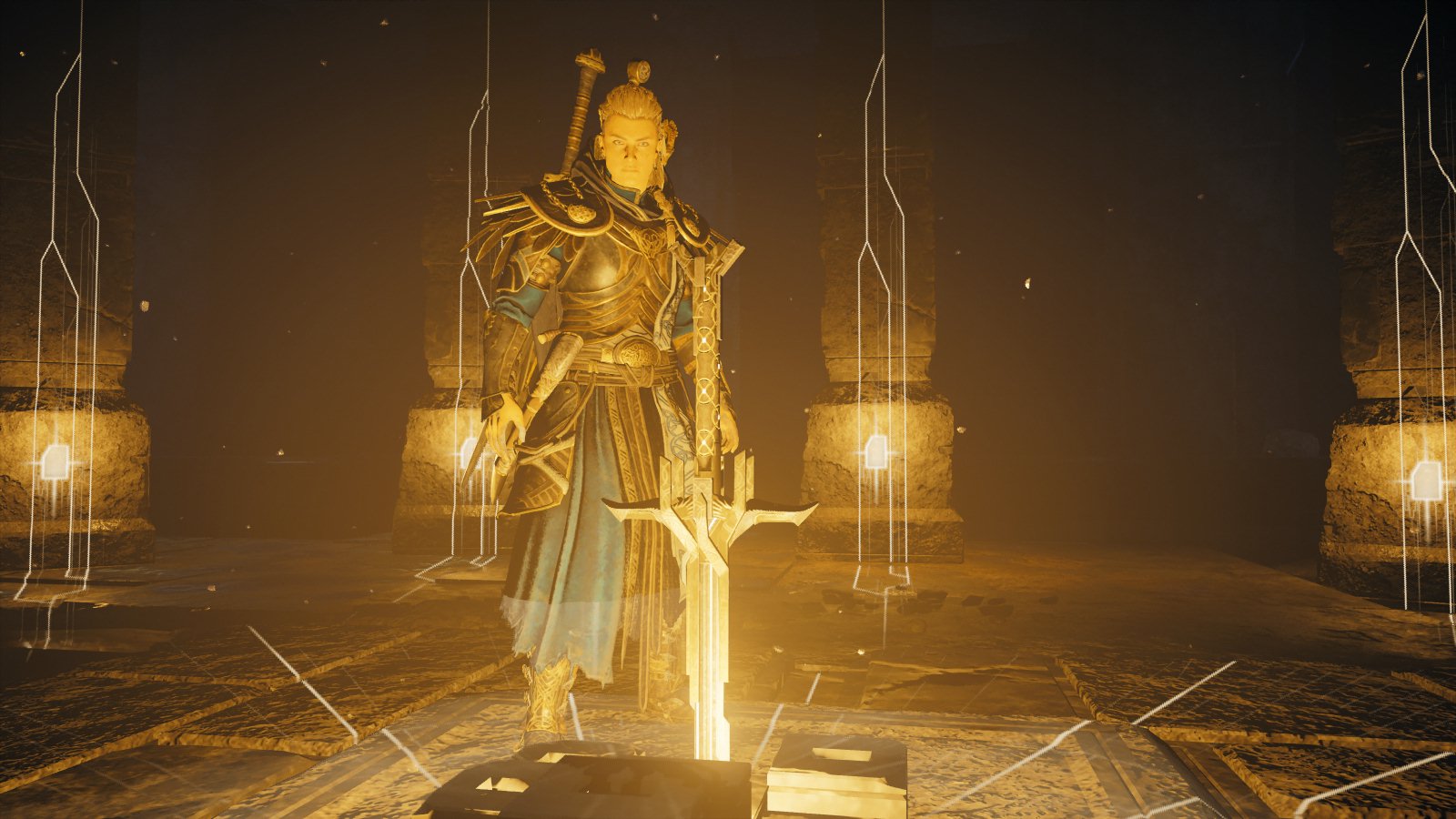 At the Cave of Gold, Eivor inserted all five shards into the pedestal, which opened a nearby door. Eivor walked through the light-emitting door and found another, larger gate, surrounded by more crazed civilians. Eivor slaughtered the civilians and stepped towards the door, unaware of another cursed civilian who had thrown a spear at her. The spear was intercepted by an arrow launched from Kassandra's bow. Kassandra fired another arrow, killing the attacker. More civilians attacked, and Kassandra joined Eivor.[252]
