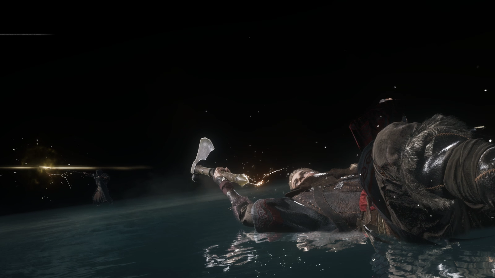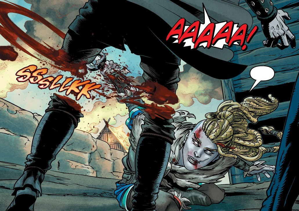 Eivor cutting Roscoe's legs in half