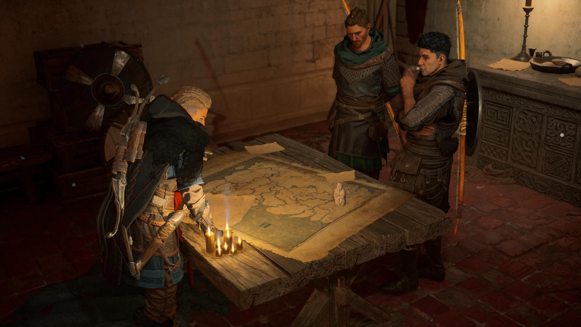 After being shown the clan's alliance map by Randvi and England's four kingdoms, Eivor named their settlement Ravensthorpe. After getting a map from Gunnar, she raided either Meldeburne in Grantebridgescire or Alcestre Monastery in Ledecestrescire to gather resources for the colony. After doing so, she returned to the settlement and had a forge built for Gunnar. Eivor then returned to the longhouse to speak with Sigurd again. As she entered, she overheard a small group speaking with Randvi describing the surrounding territories known as 'shires'. Sigurd then showed Eivor to a room, gifting it to her as her own and leaving her to read some letters before leaving the longhouse to meet with Rowan and Basim at the stables. Sigurd and the latter were to ride together before splitting up, Sigurd to meet the Sons of Ragnar in the Ledecestrescire while Basim would go to parts unknown. Sigurd left his sister in charge of Raventhorpe during his absence, something Dag did not agree with.[30]