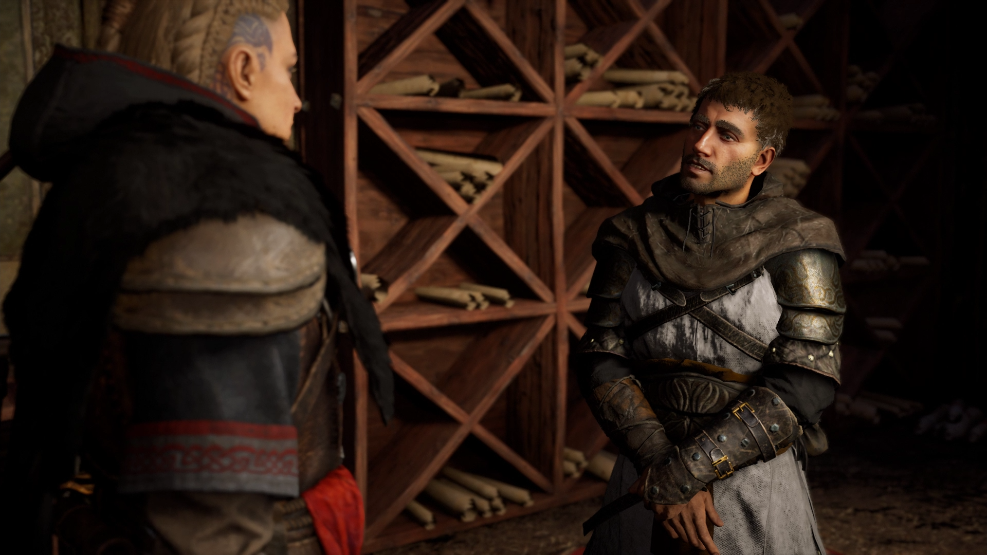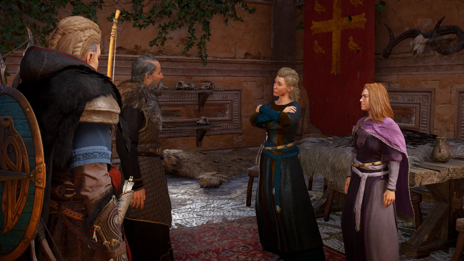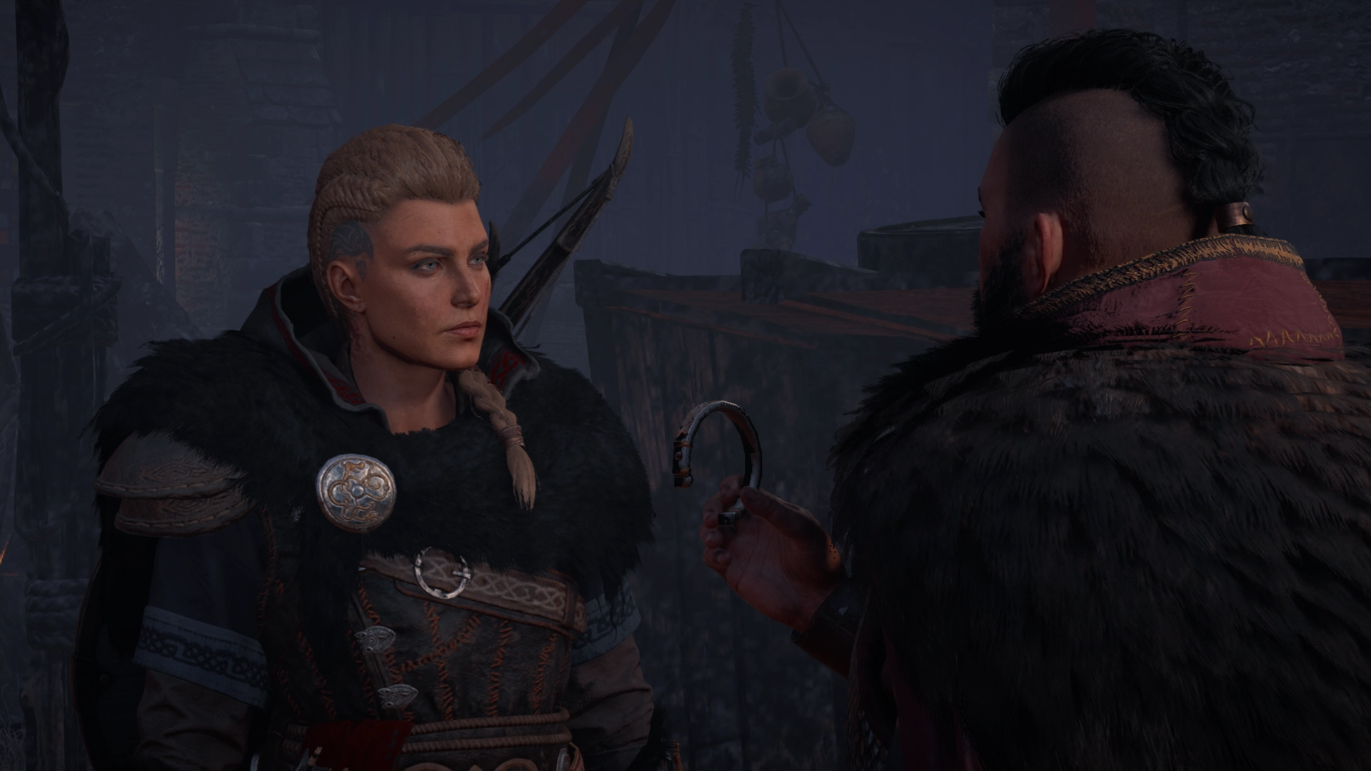 She then approached the settlement's longhouse, where jarl Harald hosted the assembly of the Norse clans. In the town tavern, she met Sigurd and Basim. Seeing that Gorm and the Wolf Clan were in the tavern, Sigurd explained to her that Harald had made a truce permitting the clans to be there. As Gorm and his clanmates left the place, Sigurd tasked Basim to keep Eivor in the tavern while he would see their father.[26]