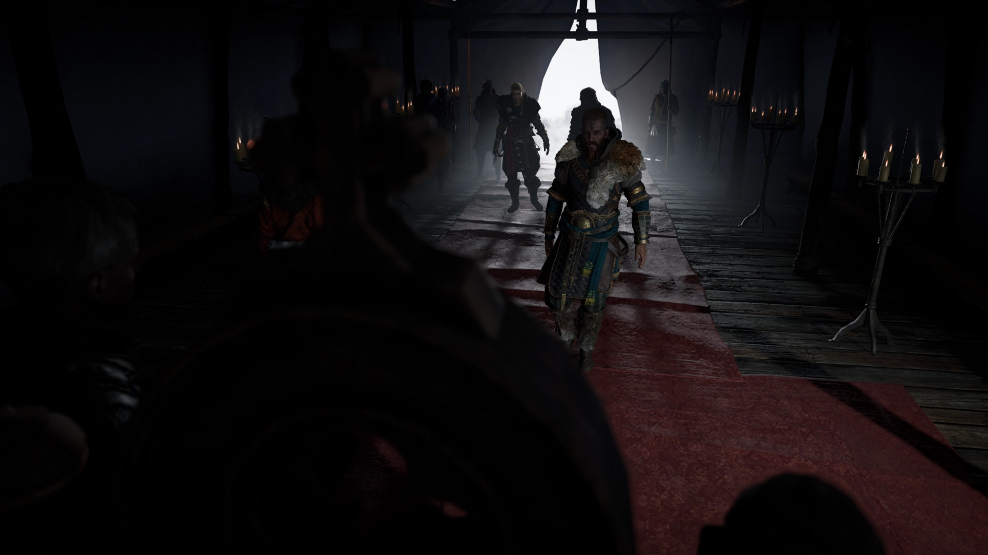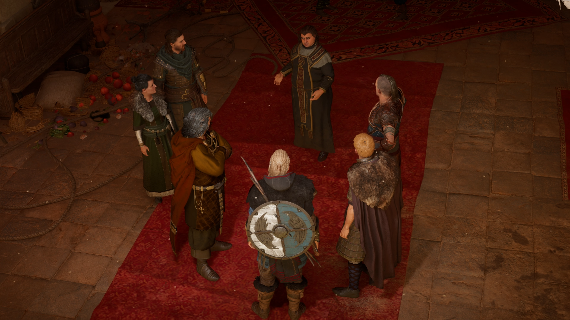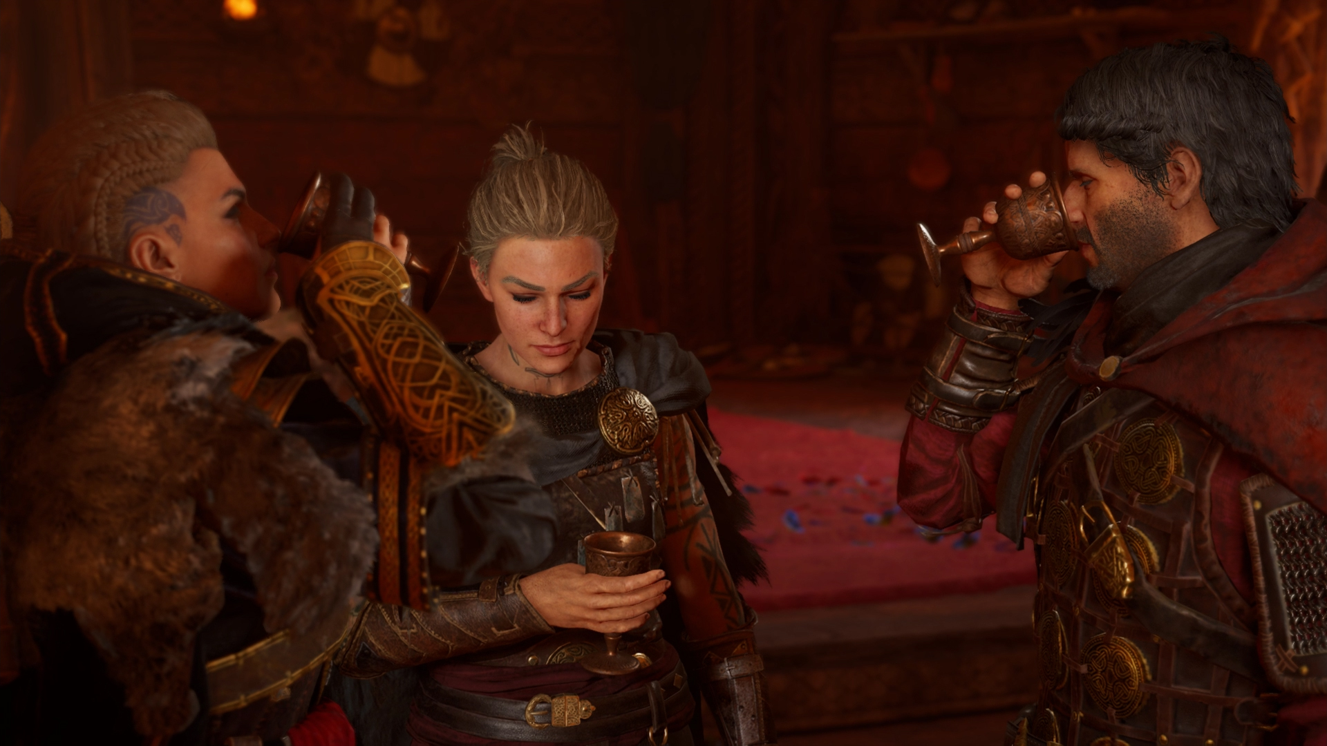 She then approached the settlement's longhouse, where jarl Harald hosted the assembly of the Norse clans. In the town tavern, she met Sigurd and Basim. Seeing that Gorm and the Wolf Clan were in the tavern, Sigurd explained to her that Harald had made a truce permitting the clans to be there. As Gorm and his clanmates left the place, Sigurd tasked Basim to keep Eivor in the tavern while he would see their father.[26]