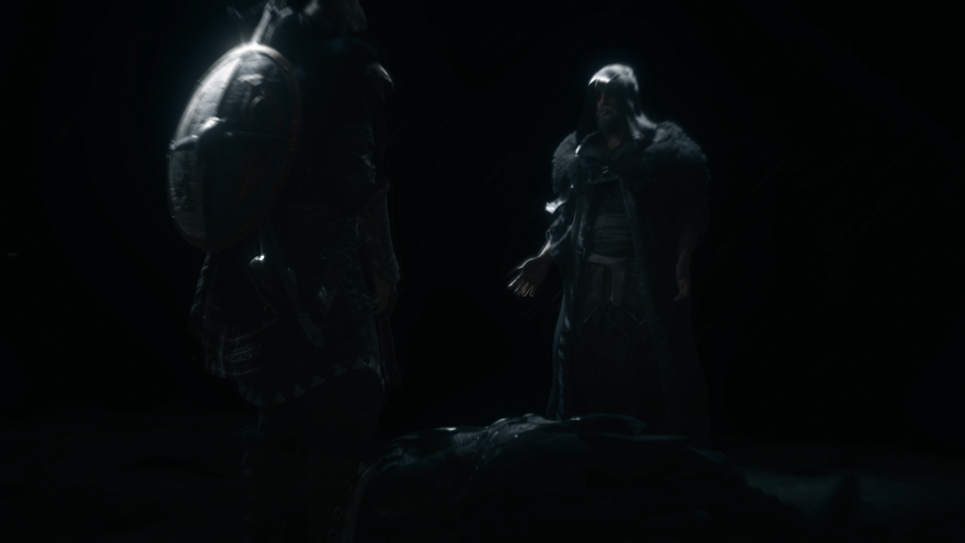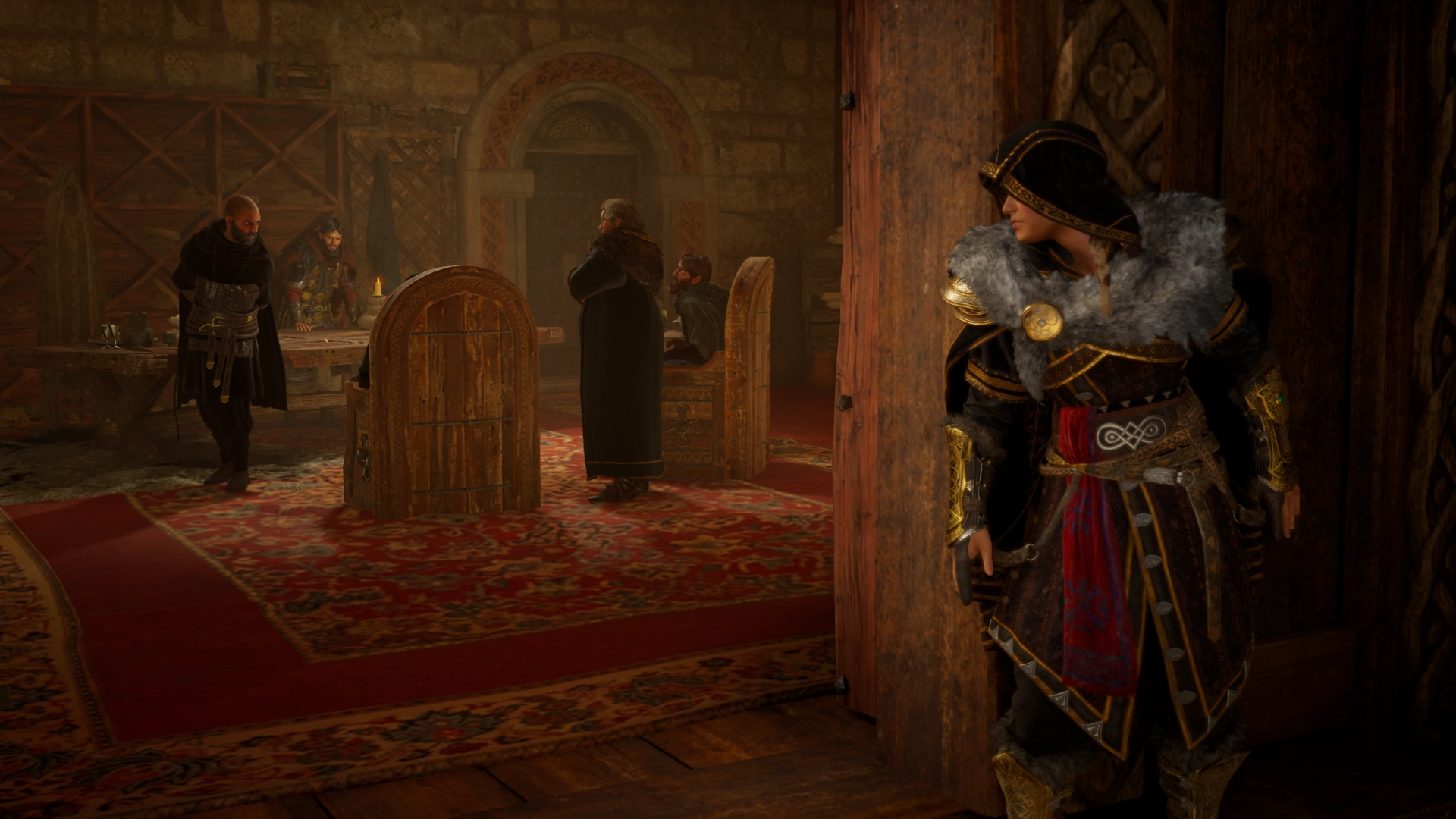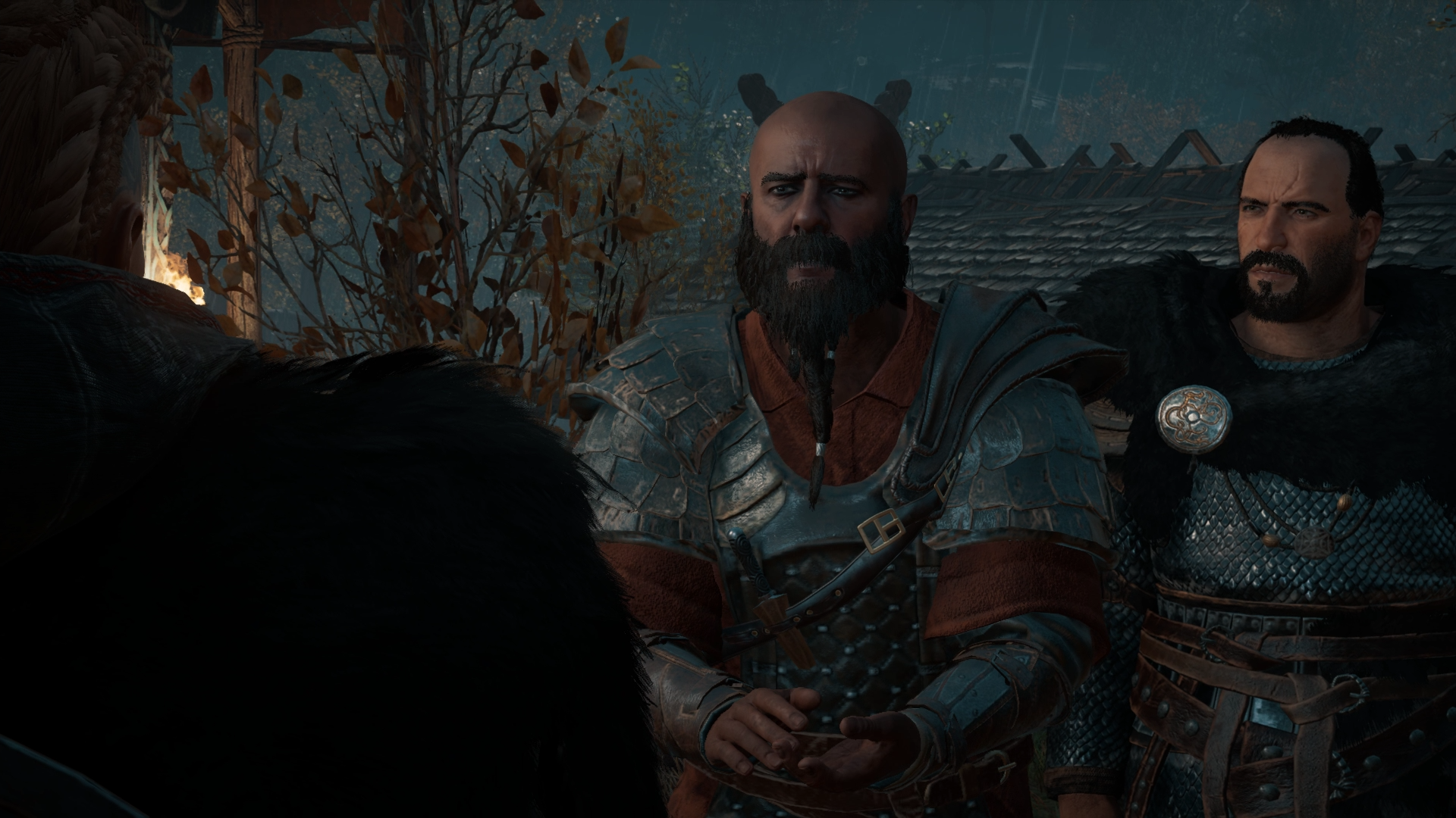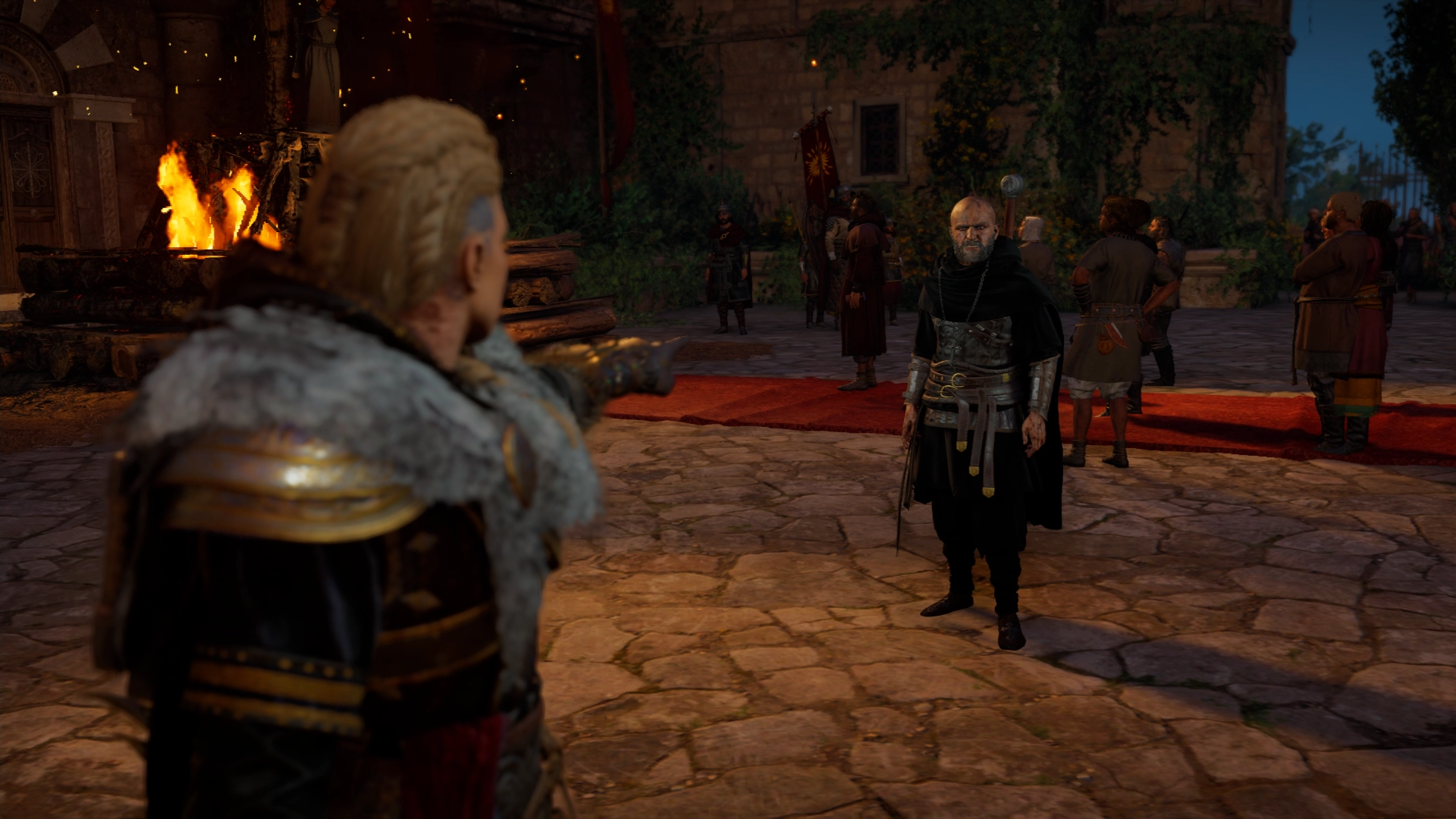 As Styrbjorn's meeting ended, Eivor met the king, who chastised her for her actions against Kjotve while she accused him of being too careful. Their argument was interrupted by a horn indicating the arrival of Sigurd.[7] Welcoming her brother at the dock, Sigurd introduced to her to his new friends: the Hidden Ones Basim Ibn Ishaq and Hytham, whom he had encountered in Constantinople. Joining their father, they decided to prepare a feast for Sigurd's return. During the feast, while Sigurd told his adventures, Eivor argued with Styrbjorn about his son's choice to bring wealth instead of defending Fornburg. She also talked with Randvi, who didn't know if the long separation from her husband broke their relationship. Eivor interrogated Basim and Hytham about their country and why they followed Sigurd.[21]