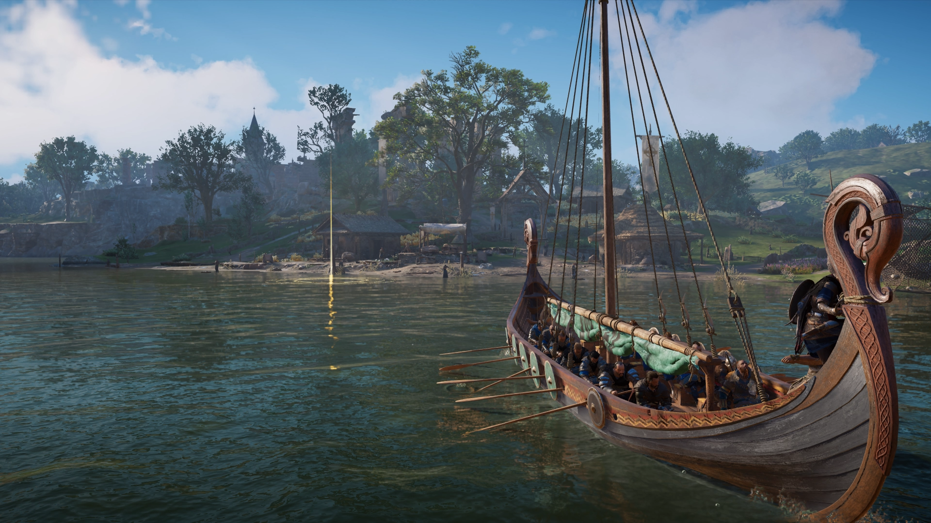 After three weeks at sea, in January of 873, Eivor and her clan arrived in the southern part of Britain. Eivor and Sigurd's longship went on ahead of the others, to clear the way leading into the land. Entering a river, the Viking crew passed by a monastery and baptism, to which all crewmembers had something to remark about Christianity. Sigurd revealed that the Sons of Ragnar would be present in the land and planned to meet and ally with them. They then came to a river chain blockade which Eivor later removed after killing all the soldiers present in the outpost. The longship then pulled back around to collect her and continued on its way. Further ahead, they caught sight of an abandoned settlement which was previously owned by Halfdan Ragnarsson.[28]