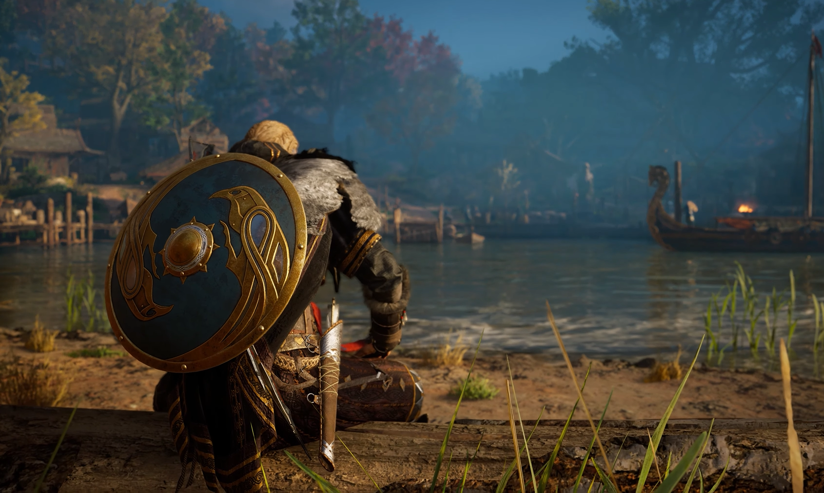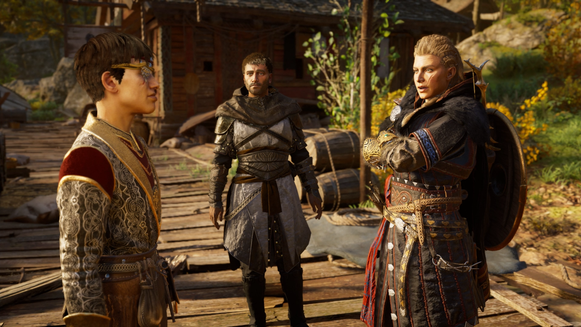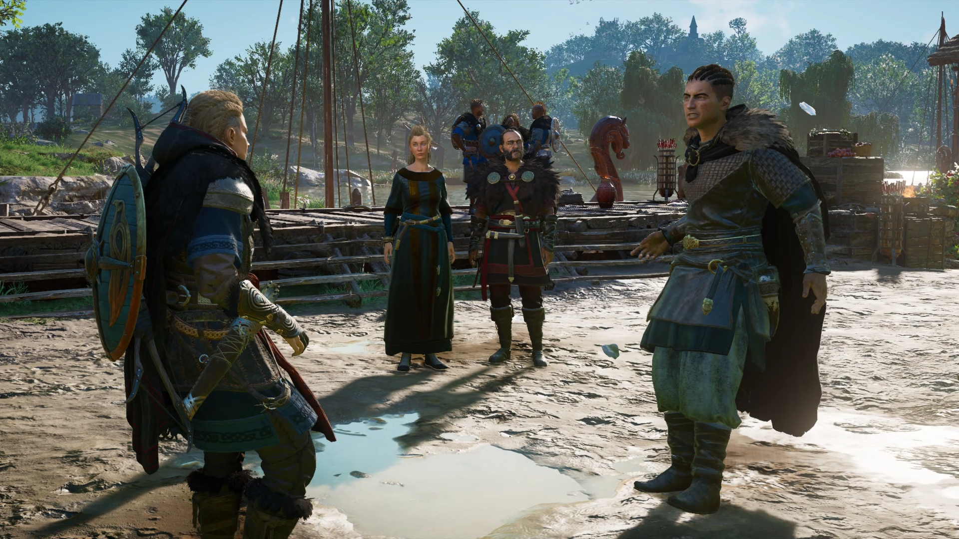 Eivor, Sigurd, and Dag step foot on the foreign dock