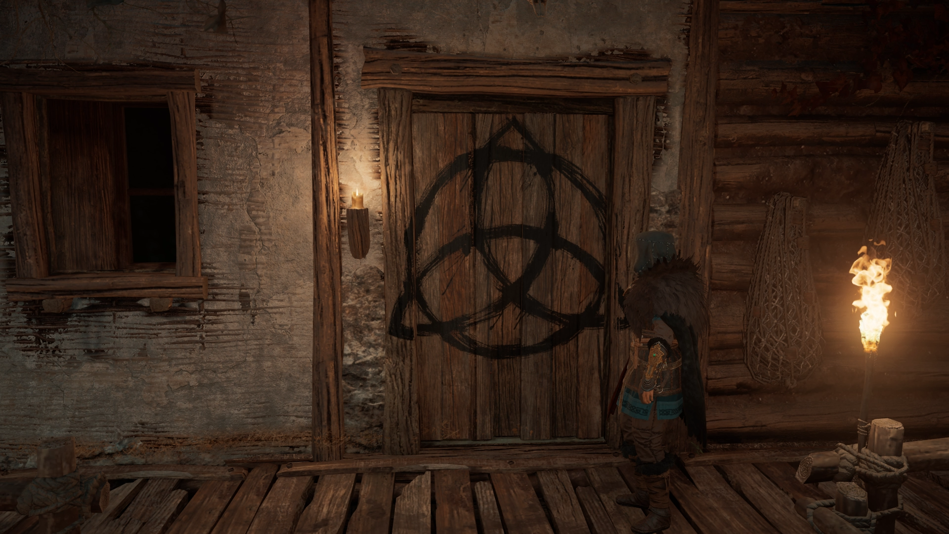 Eivor immediately awoke after the vision, and went to tell Valka, who could help her make sense of the dream. Eivor reached and pulled a mistletoe from her neck, which she brought to Valka. After a conversation about the mythology behind Baldr and Frigg, Valka gave Eivor a potion and told her to go behind the hut, where the seer performed a ritual on Eivor. A ring of fire surrounded Eivor, who stood between four bunches of mistletoe. The shieldmaiden was then transported back to Svartalfheim.[254]