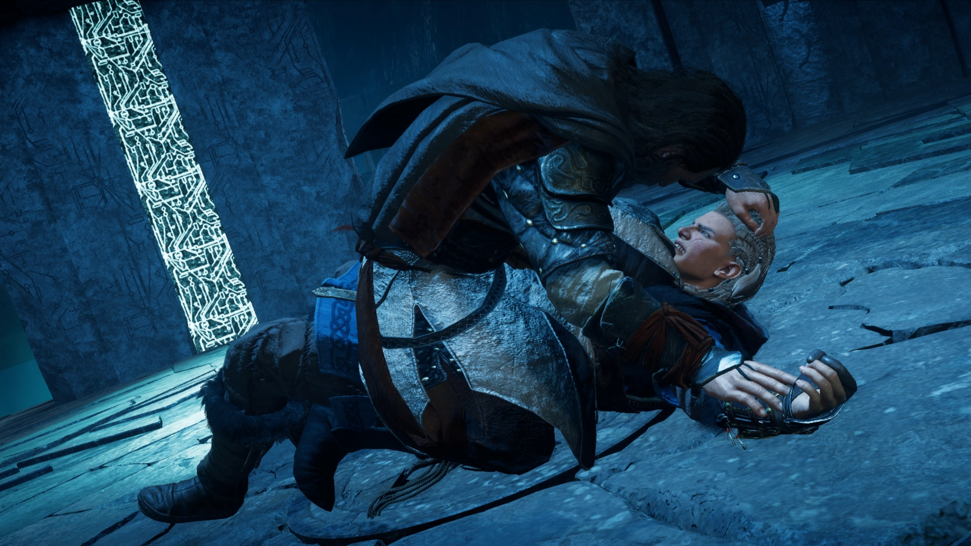 Eivor envisioning herself as Havi fighting the Isu scientist Calder