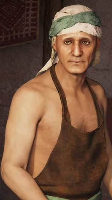 In addition, Harkhuf also sent Bayek to recruit Amosis, a fish merchant and a friend Jeska, who had been previously captured and was thought to have been killed by Sefetu. Amosis was able to direct Bayek to Jeska's whereabouts and assist the smuggler. Jeska would later return to Sais to meet with Harkhuf in order to come up with a plan to deal with Sefetu.[1] However, Jeska arrived too late as Harkhuf himself was captured by Sefetu, who brought him to Fort Nikiou and imprisoned him in a cellar. Bayek, learning of this, travelled to the fort, where he killed Sefetu and escorted Harkhuf to safety.[3]