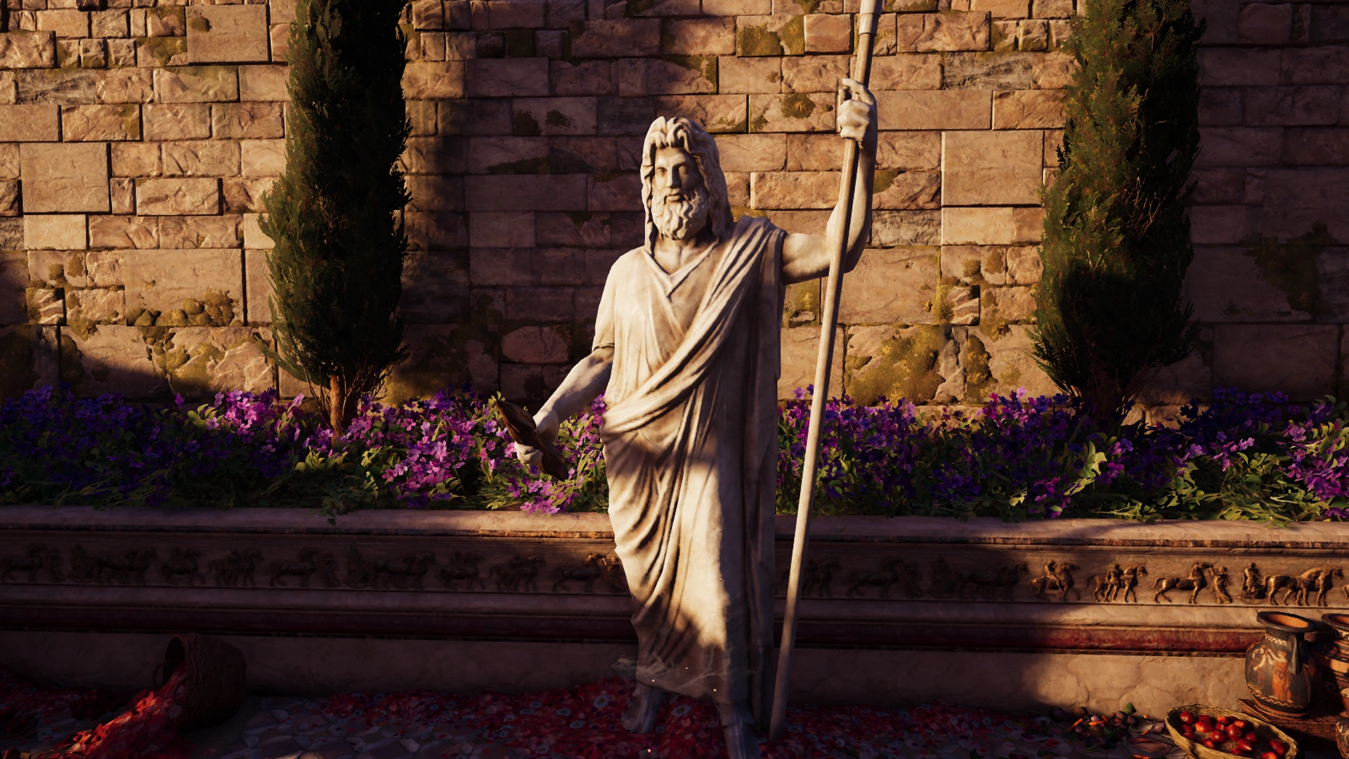 Several statues of him also graced locations like Mount Ainos on the island of Kephallonia, though most notable among them was the statue made by the Athenian sculptor Phidias in Temple of Zeus within the Sanctuary of Olympia in Elis. The Spartan misthios Kassandra visited a number of them over the course of her journeys.[8]