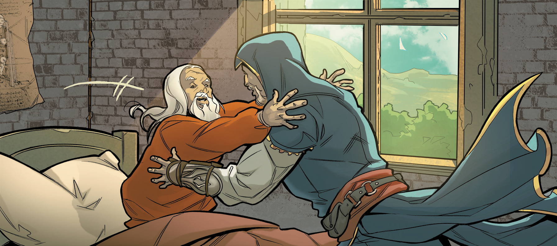 Leonardo receiving a Codex page from Ezio