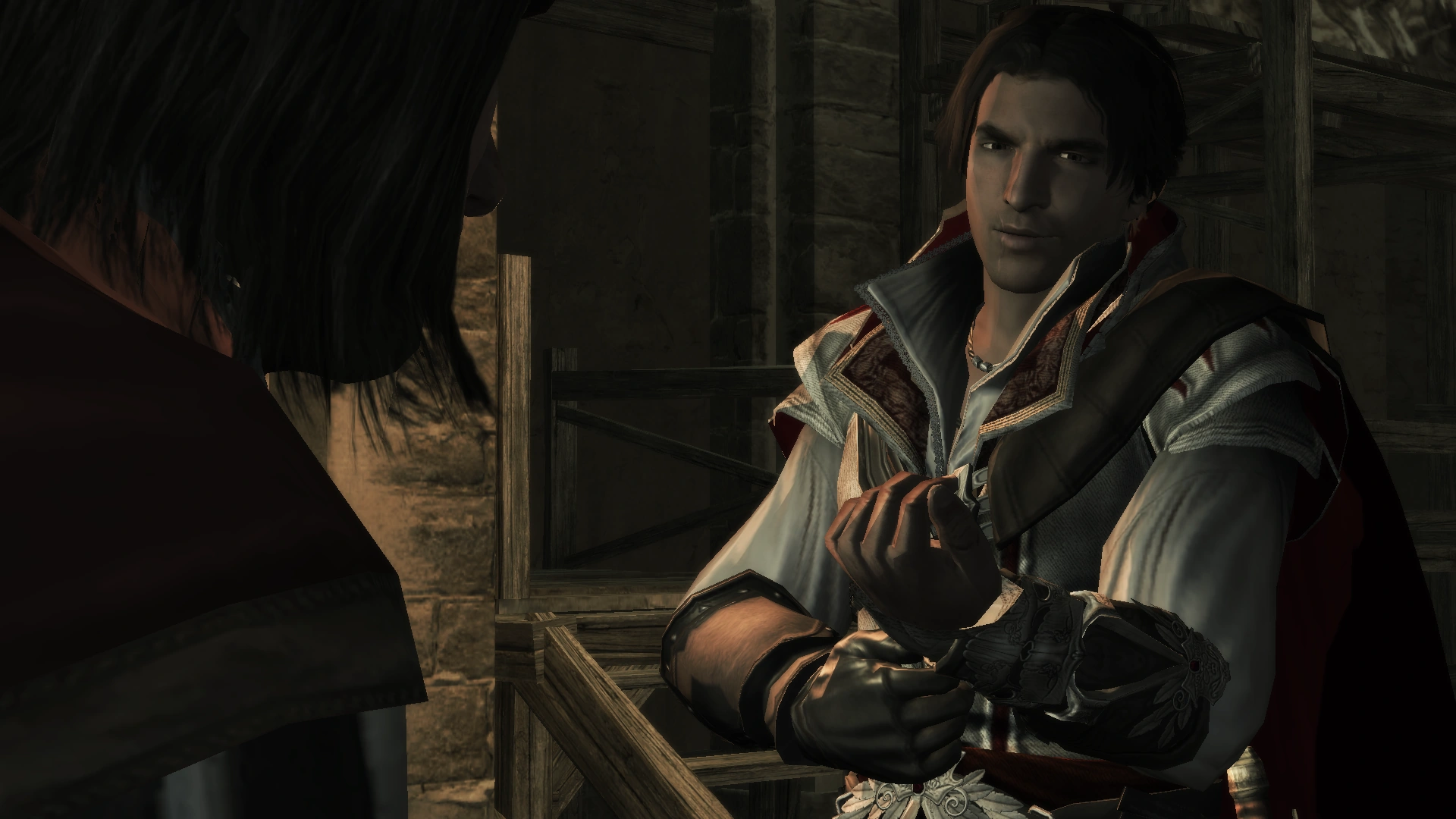 Alvise again guided them onward, near the Palazzo della Seta. The three saw the harassed stall owner walk up to the guards at the entrance of the Palazzo to demand compensation, but the guards only arrested him for "disrupting commerce." Eventually, Leonardo and Ezio reached the former's workshop and they parted ways with a brotherly embrace after Leonardo reminded Ezio that he could visit him anytime if he needed another Codex page decrypted.[13]