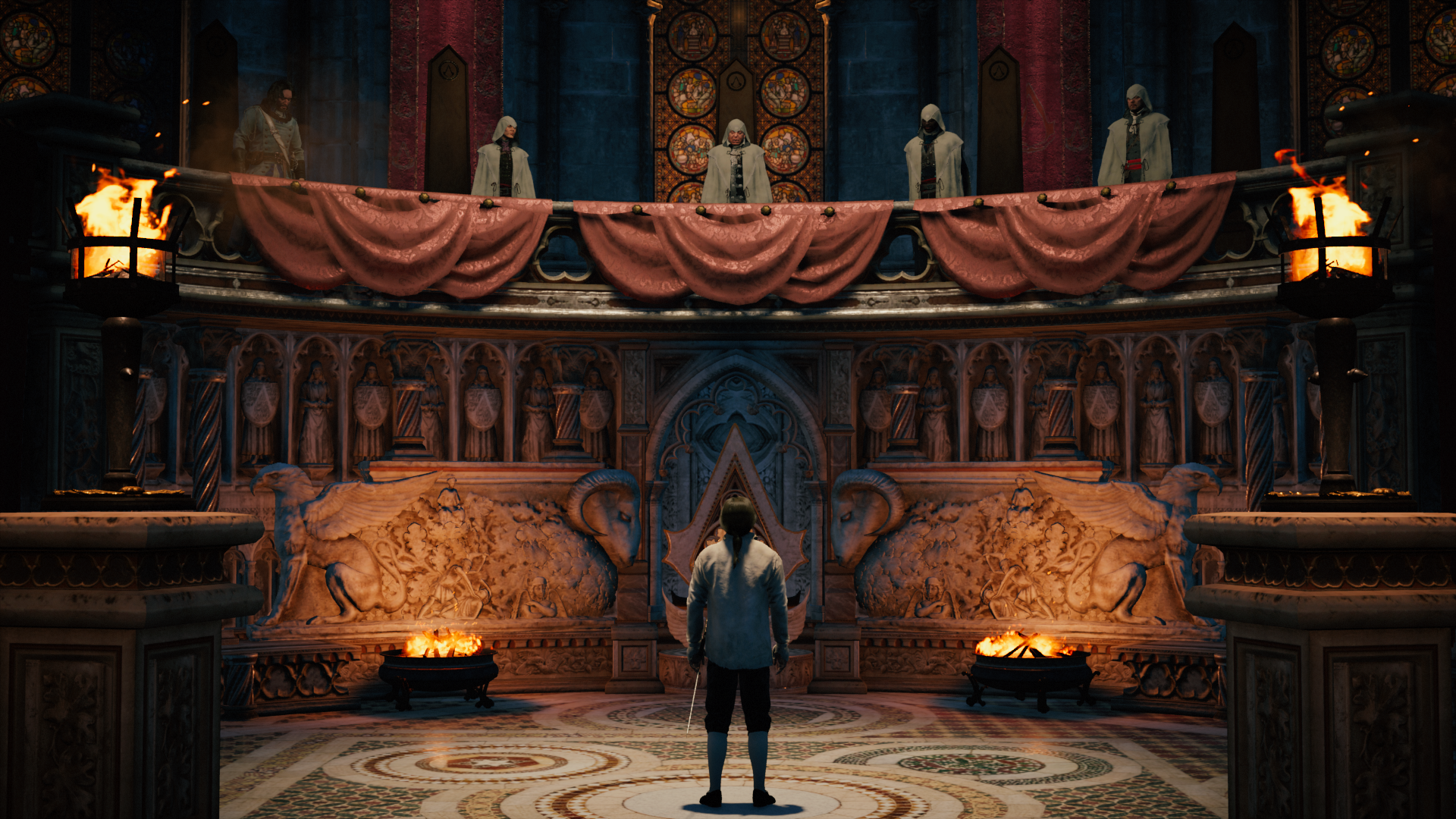 Al Mualim elevating Altaïr Ibn-La'Ahad to the rank of Master Assassin