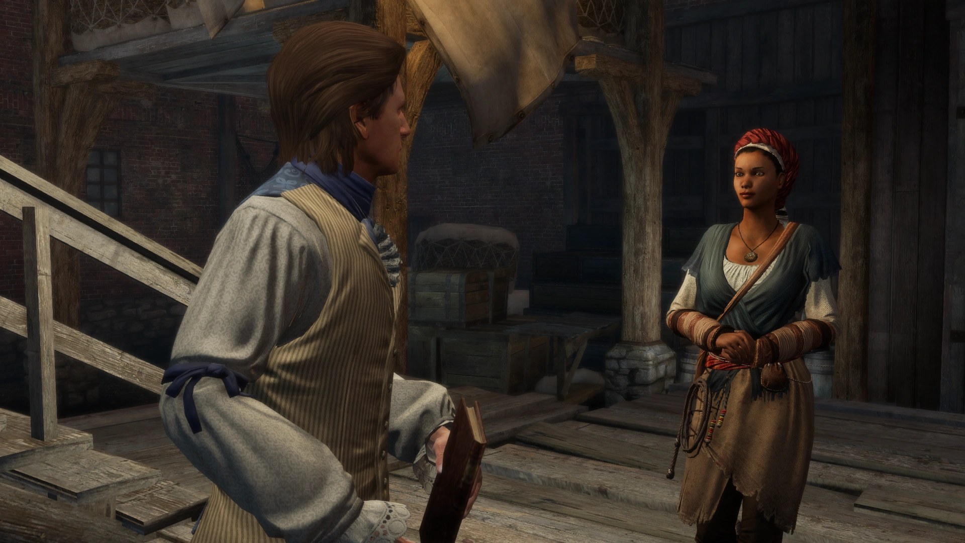 With her weapons now restored to her, Aveline went out to locate the recruiter. Finding him by a small church, she tailed him through the market until he reached a pair of guards.