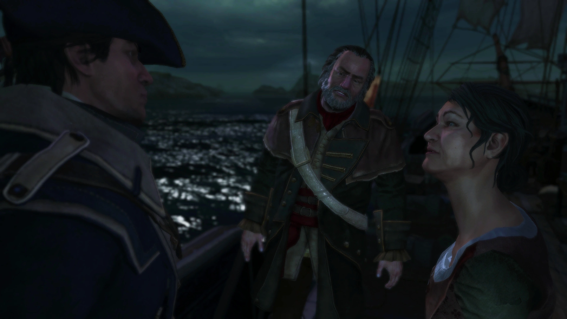 Six months later, after the Aquila had been repaired, Faulkner invited Connor along to have the ship fitted with cannons. Connor joined him without hesitation, and the two were out at sea for weeks, where Faulkner taught Connor how to both sail the ship and fire her cannons. Making a stop at Martha's Vineyard, Faulkner went to recruit David and Richard Clutterbuck as gunnery officers for the Aquila while Connor spotted Benjamin Church conversing with the Royal Navy junior officer Nicholas Biddle in a tavern.[18]