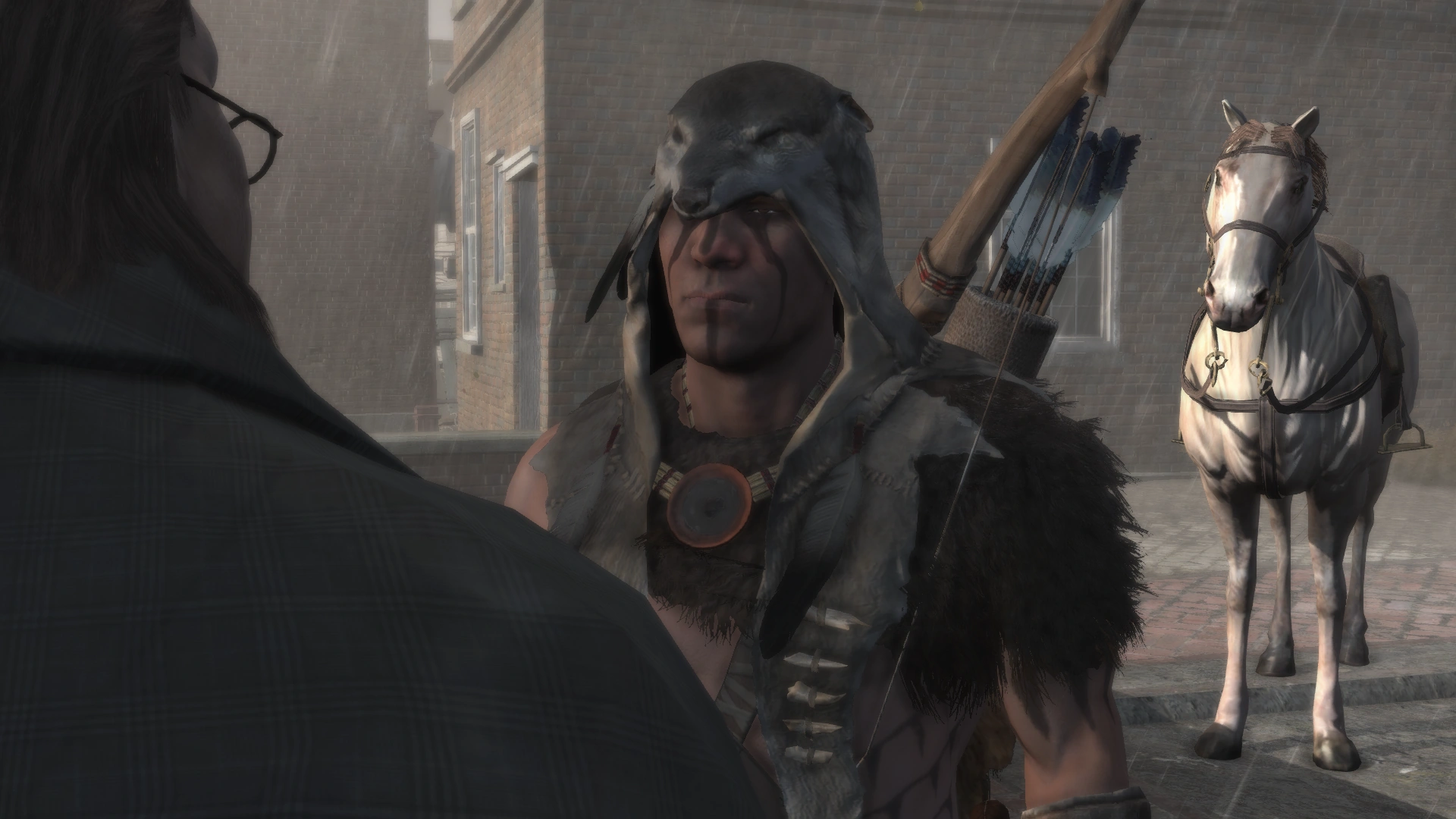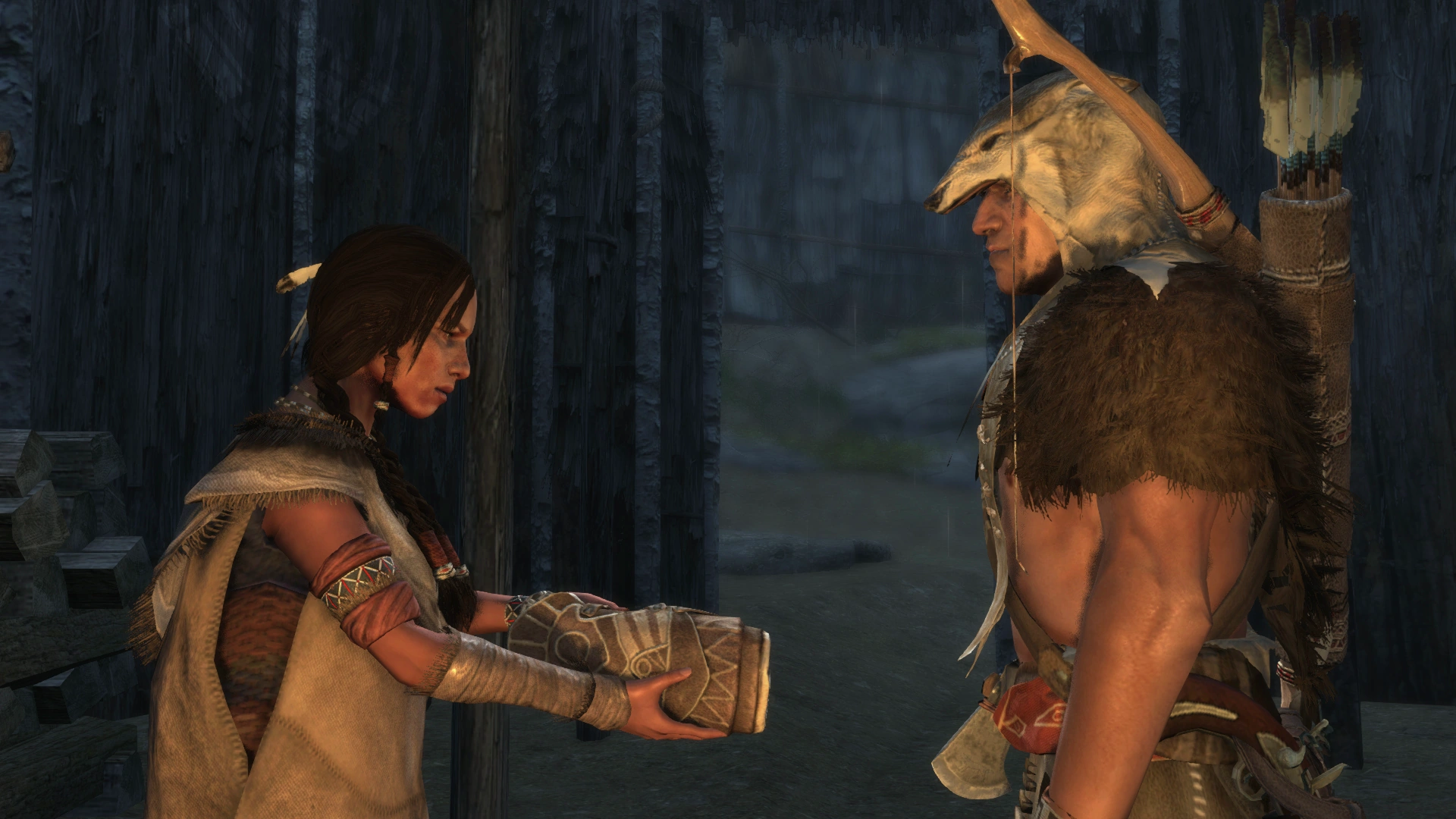 Connor put down the wolf with his Hidden Blade and discovered that the animal was driven mad by a festered gunshot wound from a musket. Returning to Io:nhiòte, he was amazed to find that she was aware of his encounter with the wolf because she had seen it through the eyes of an eagle. Realizing the extent of her potential, Connor stated that he had indeed a great deal to teach his daughter.[122]