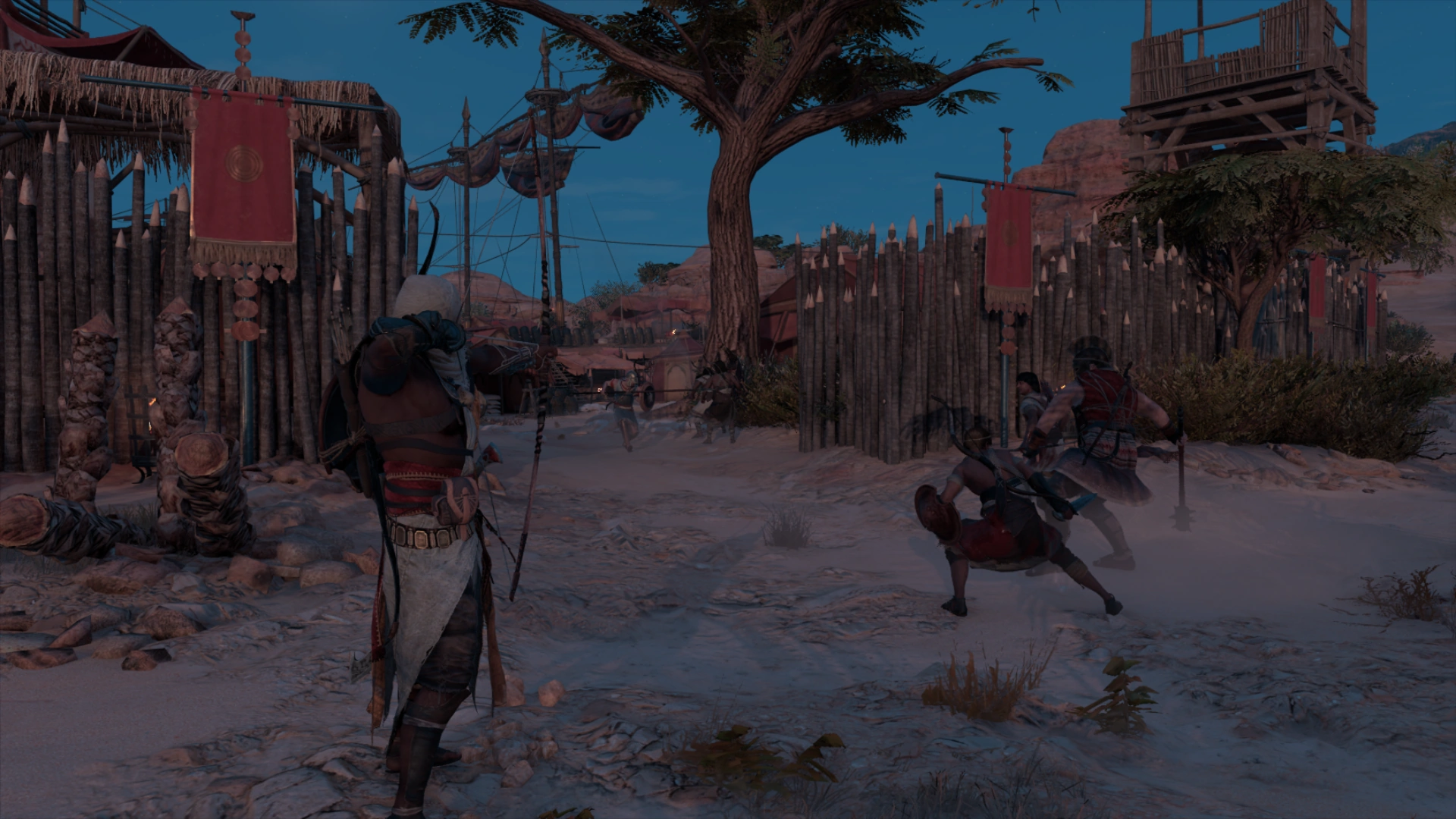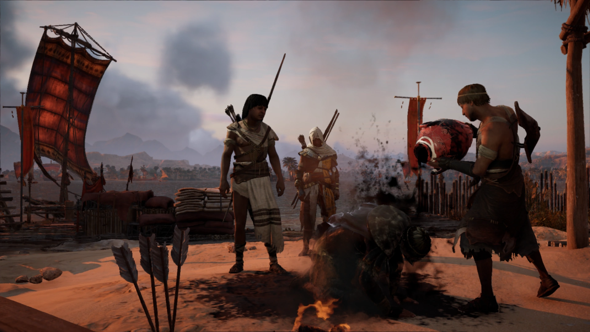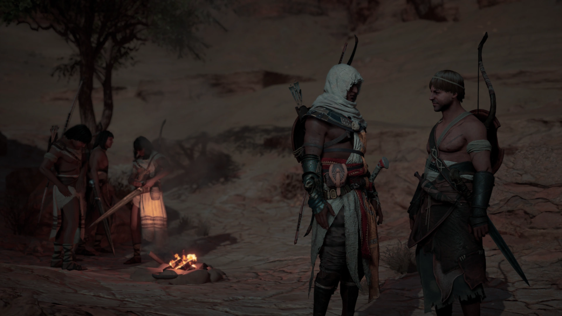 Bayek found a group of men sitting around a fire west of Soknopaiou Nesos, and approached them.