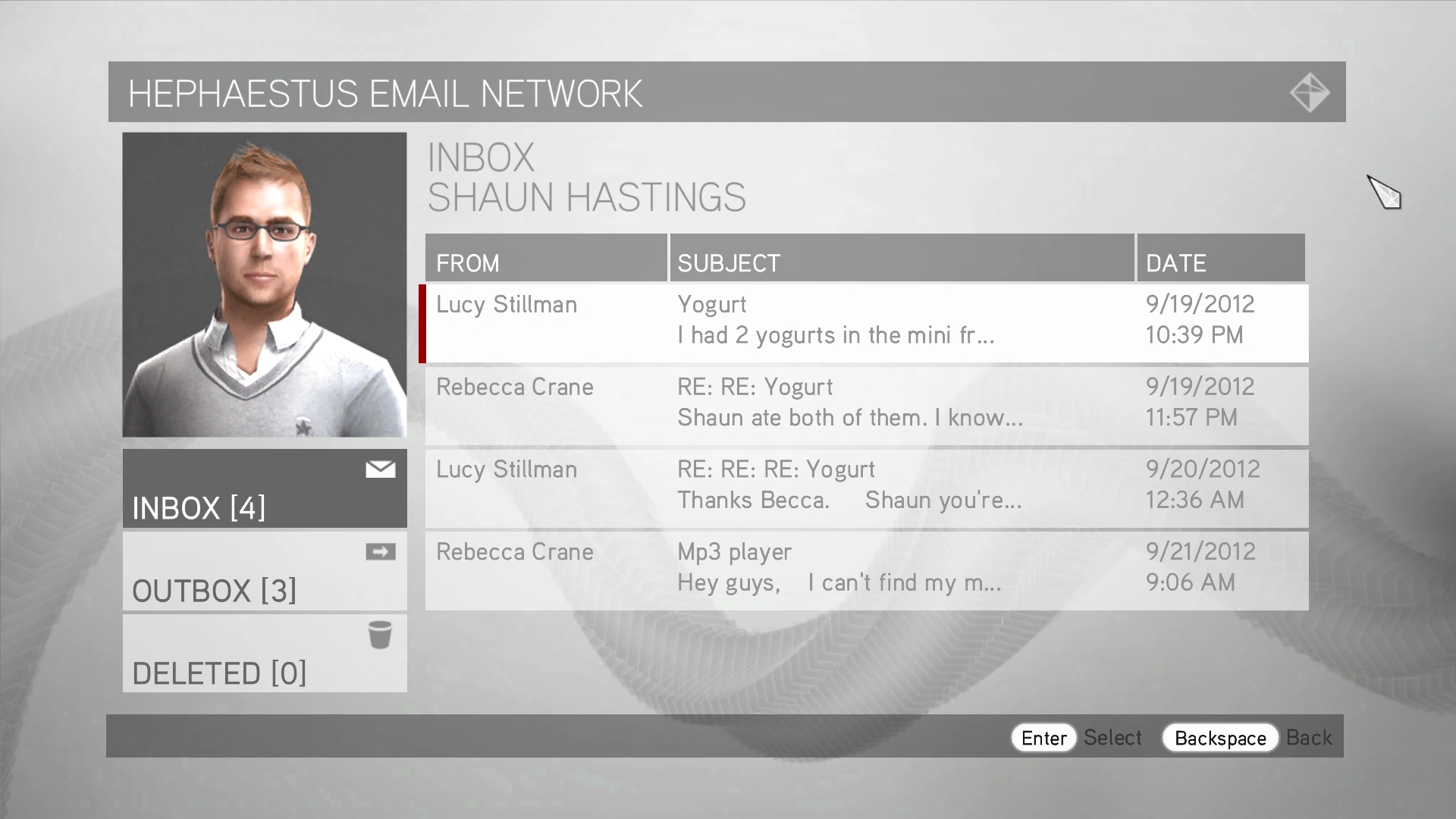While based at the Sanctuary beneath the Villa Auditore in Monteriggioni, Shaun Hastings exchanged and received a series of emails through the Hephaestus Email Network with Rebecca Crane, Lucy Stillman, and Desmond Miles. It was available for Desmond to read, once he received an email from Erudito containing the passwords of all the people in the Sanctuary.[1] After arriving at the Grand Temple near Turin, New York Shaun continued to exchange emails with Desmond, Rebecca, and William Miles.[2]