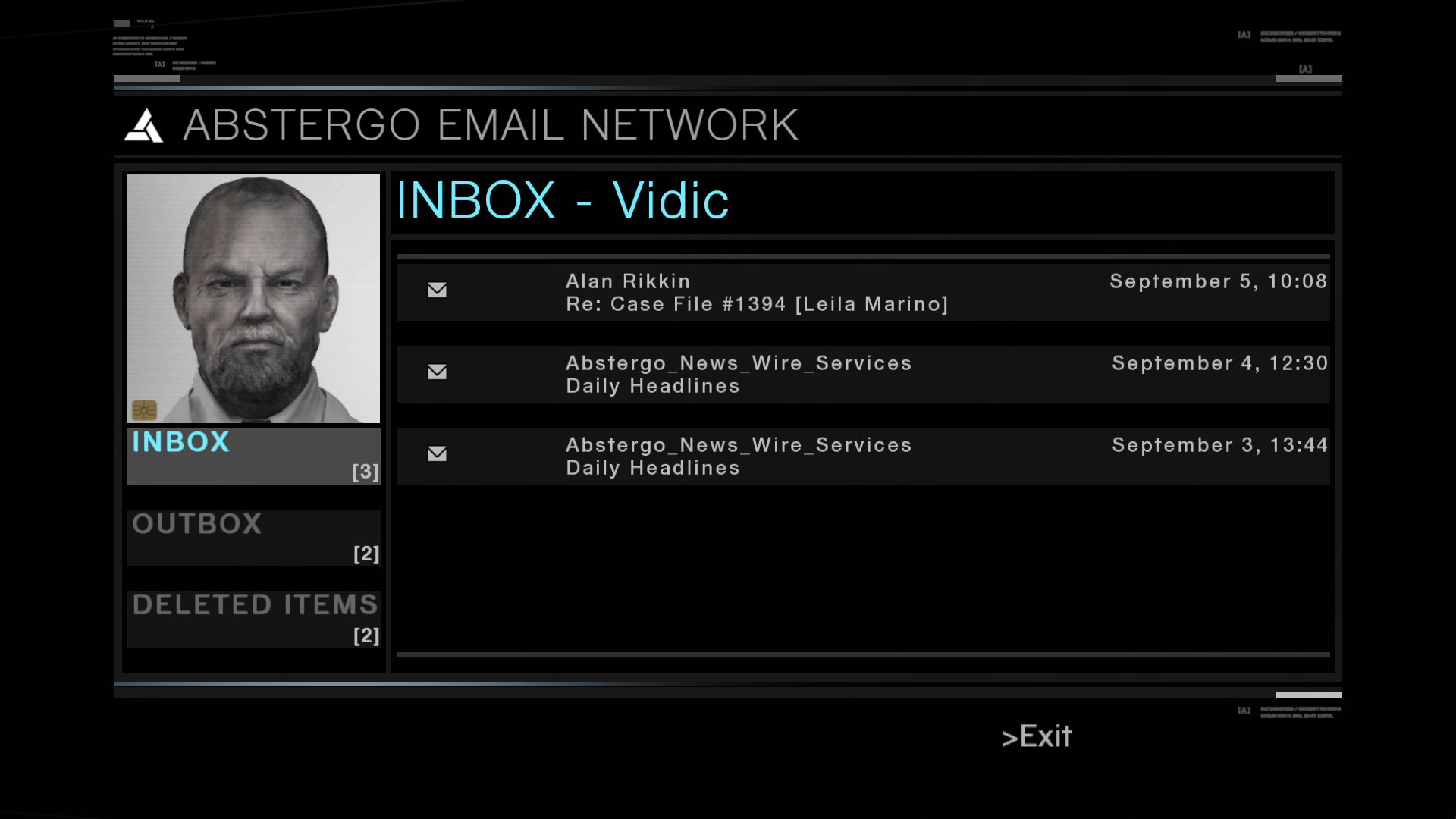 While working at Abstergo Industries, Warren Vidic exchanged and received a series of emails through the Abstergo Email Network.