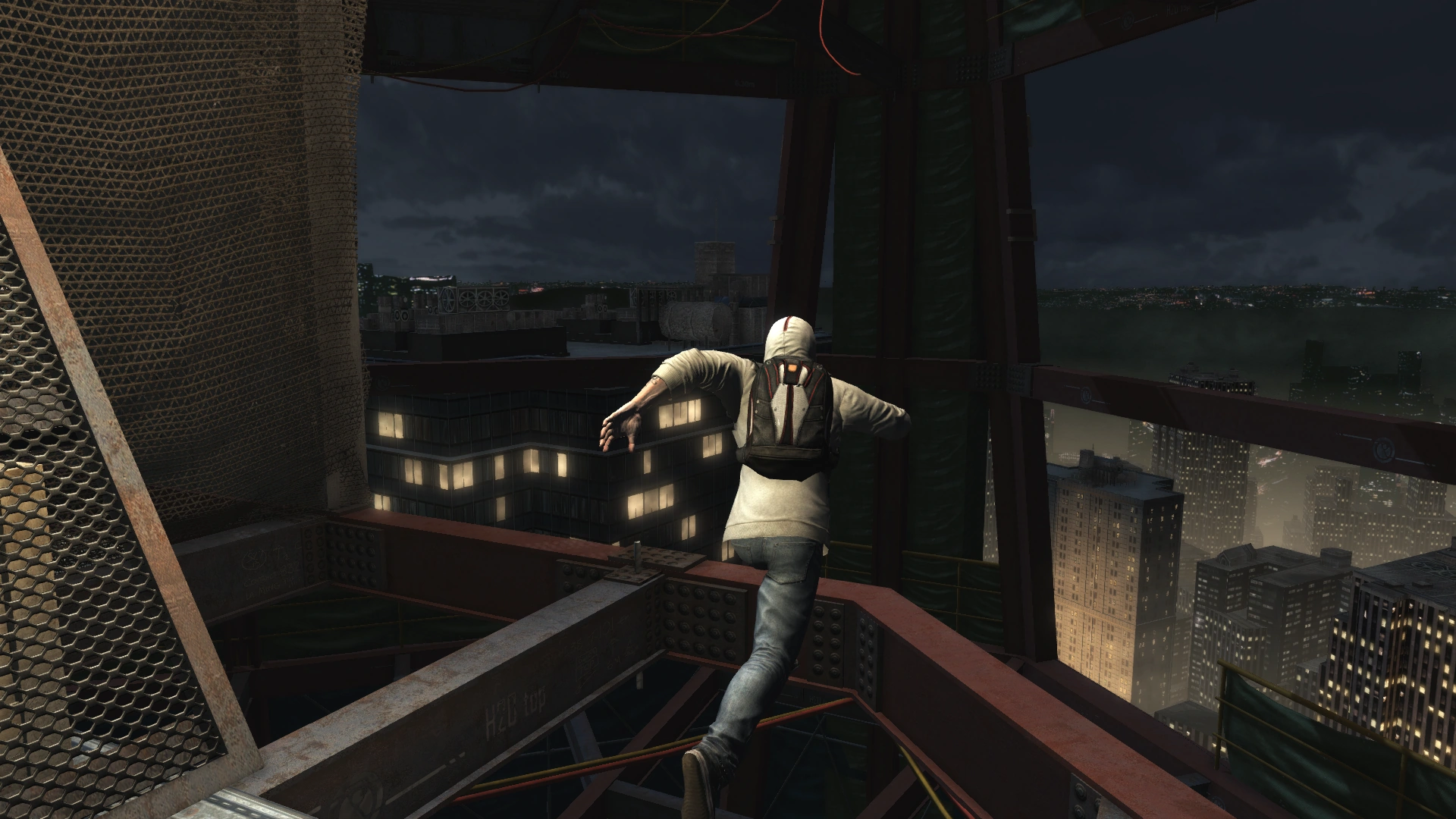 在2012年,戴斯蒙德·迈尔斯的刺客小队追踪到大神殿的一个能量源就位于曼哈顿下城的一个写字楼的顶层公寓里。由于直接潜入会容易被察觉,因此让戴斯蒙德从高处跳伞进入。[2]在2012年11月16日晚上11点03分,[3]戴斯蒙德登上这座当时还未完工的塔楼,在建筑工地上跑酷穿行,利用起重机、悬挂桁梁和电缆,一路往上爬。到达最高的起重机后,他施展信仰之跃,并用降落伞滑翔至目的地点。[2]