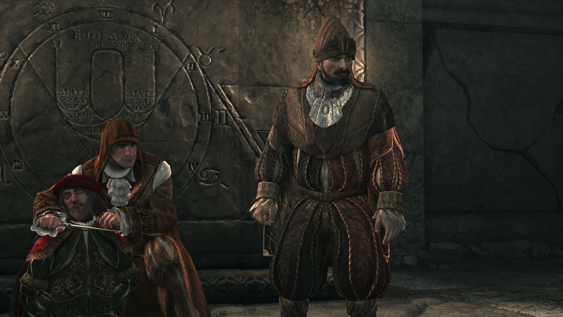 在丢失了所有的五幅画后,埃尔科莱回到了罗马地下墓穴,亲自审问莱昂纳多。尽管受到了很大的压力和身体上的折磨,他还是拒绝合作,直到意大利刺客导师埃齐奥到来。[2]