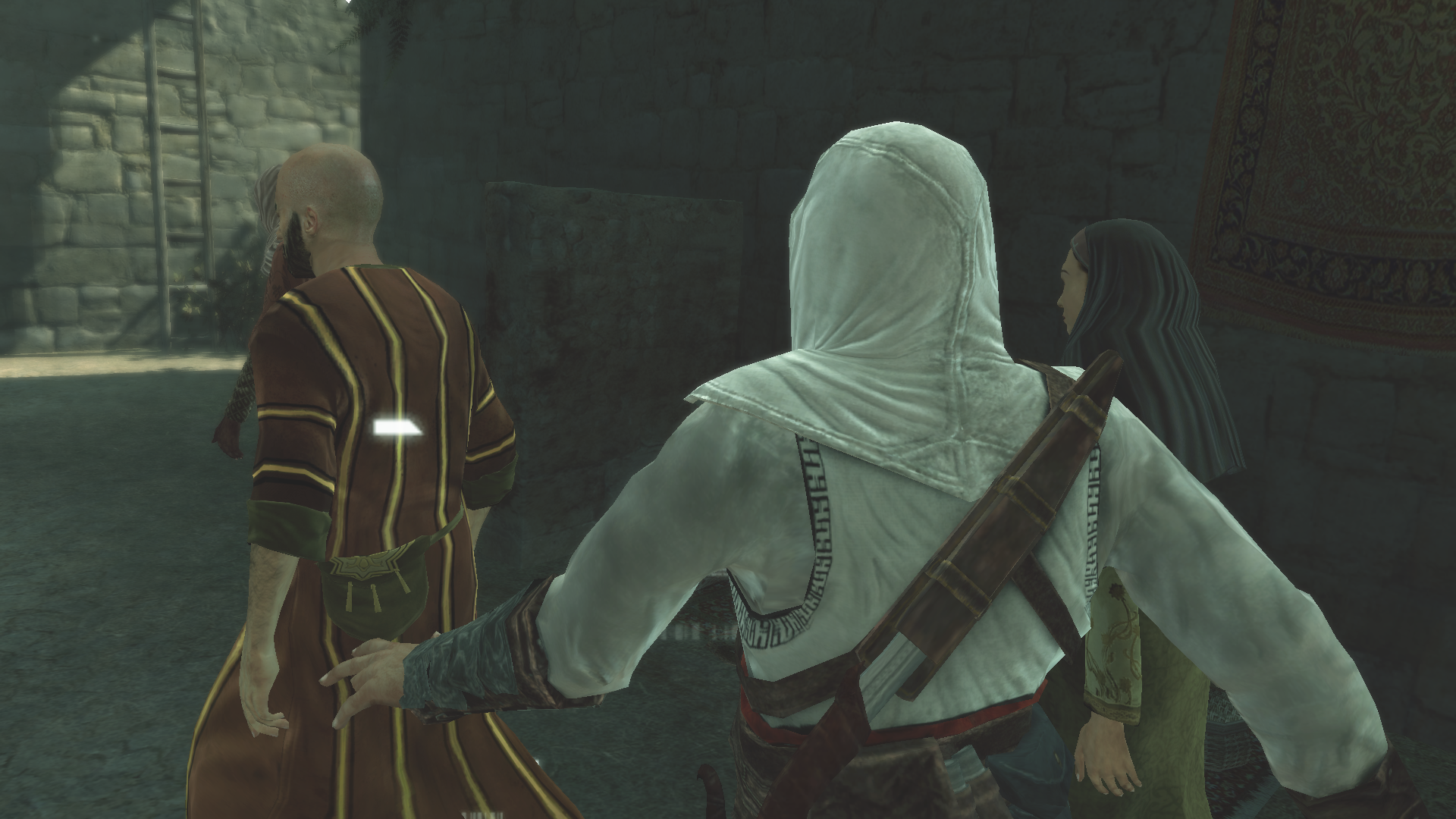 市民乙语毕便离去了。阿泰尔盯紧了身上揣着地图的热心市民:他紧张得急促不安,每走几步就要停下来看看有没有可疑的人。然而技艺娴熟的前刺客大师只是缓缓接近他的背后,伸手轻柔而不起眼地摸索几下,地图就到了他的手中。阿泰尔迅速离开去检视这份情报,只留下发现自己许久的努力突然丢失的勇敢市民惊慌地摸索着腰部。