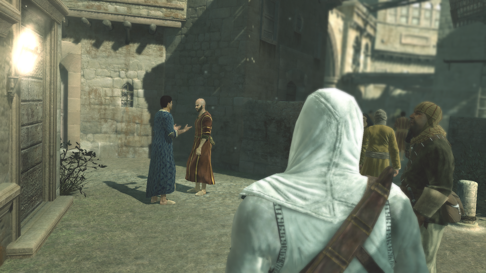 在城中四下寻索的阿泰尔行至一处街角,只见两名穿着较华丽装束的市民站在街巷拱门旁的店铺前,专注地交谈某些重要事务。阿泰尔敏锐地察觉到他们的聊天内容可能包含关键的线索,他小心地接近两人,保持着安全的距离。刺客竖起耳朵,聆听二人正在激烈讨论的话题,而沉浸在言辞交错中的市民们并未察觉他的存在。