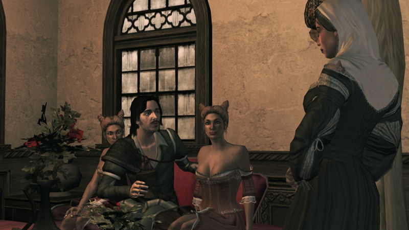 泰奥多拉和安东尼奥接着指示埃齐奥利用泰奥多拉的交际花们引开但丁的注意力,这让他有机会偷走面具。埃齐奥成功地进入了派对见到了泰奥多拉,她提供了姑娘来帮助埃齐奥免于已经得知他到来的卫兵的搜查。马可出现后,埃齐奥刺杀了他,并回到了玫瑰之贞。他试图与泰奥多拉共度一夜,但她打断了他的念头,让姑娘们去陪她。[1]