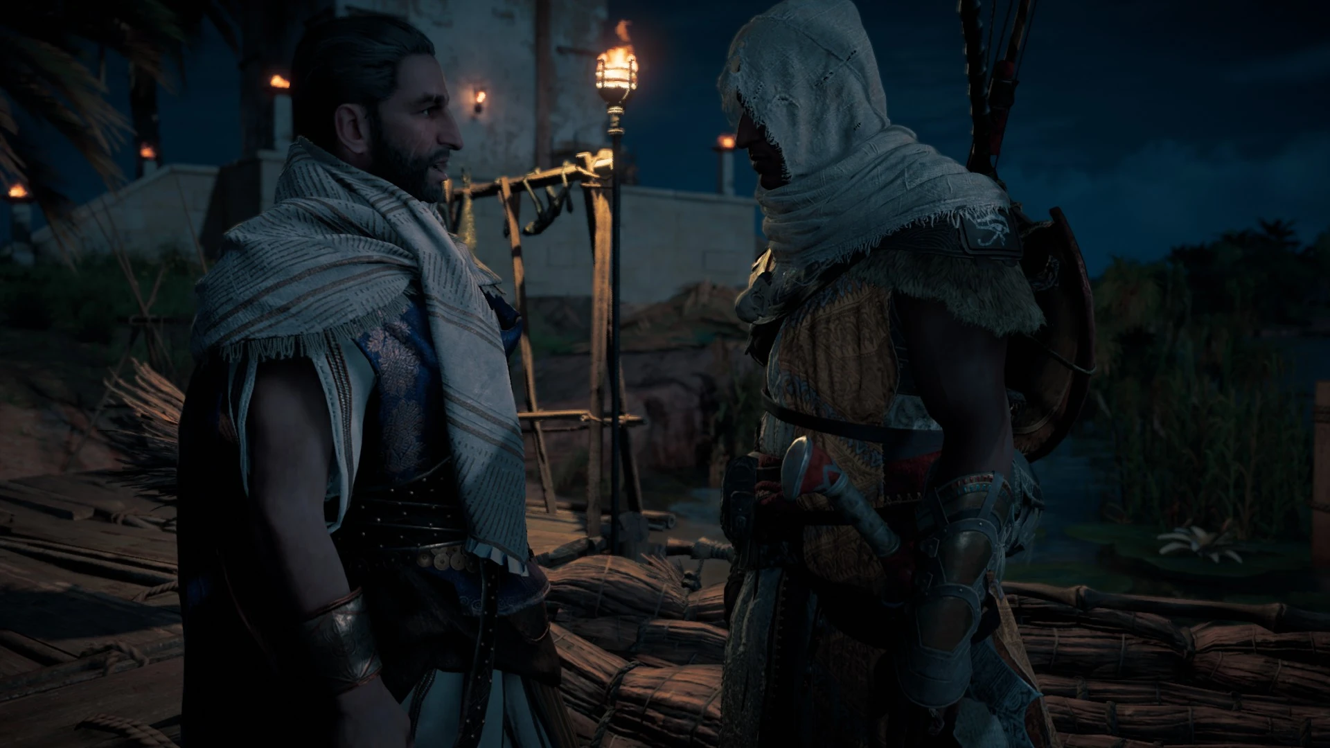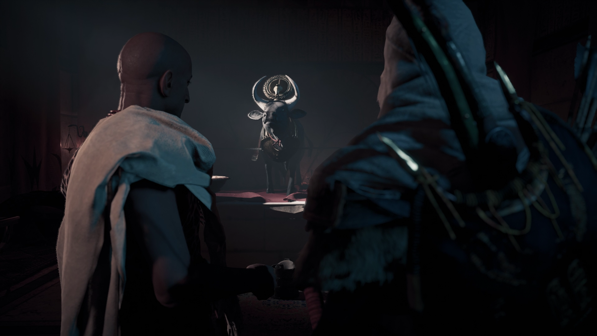 在外面,他受到了艾雅的亲切迎接,她也在追捕"蜥蜴"。两人前往神庙的途中,巴耶克请求艾雅在猎杀结束后留在他身边,但艾雅表示自己效忠于克利奥帕特拉,这让巴耶克质疑她为何还要维持与女王的关系。两人调查了神庙,发现导致阿匹斯圣牛生病的罪魁祸首是双胞胎女祭司泰欧斯和塔维。在审问下,她们供认自己的哥哥潘卡拉特斯被绑架,她们被要挟毒害圣牛。巴耶克救出潘卡拉特斯后,他透露两次下毒事件的幕后黑手是城中一位阿努比斯神庙的祭司,此人戴着蓝色围巾,并有持续咳嗽的症状。[15]