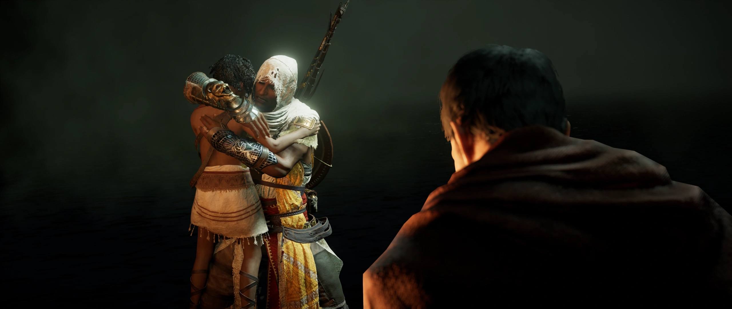 在附近的海滩上,巴耶克与艾雅决定为了更崇高的目标牺牲他们的婚姻并就此分离,各自去号召民众起身反抗压迫者。巴耶克将卡慕的老鹰头骨丢弃在地上,宣称一个新的信条已然诞生;头骨在沙地上留下的印记形状日后启发了刺客徽记的设计。[24]