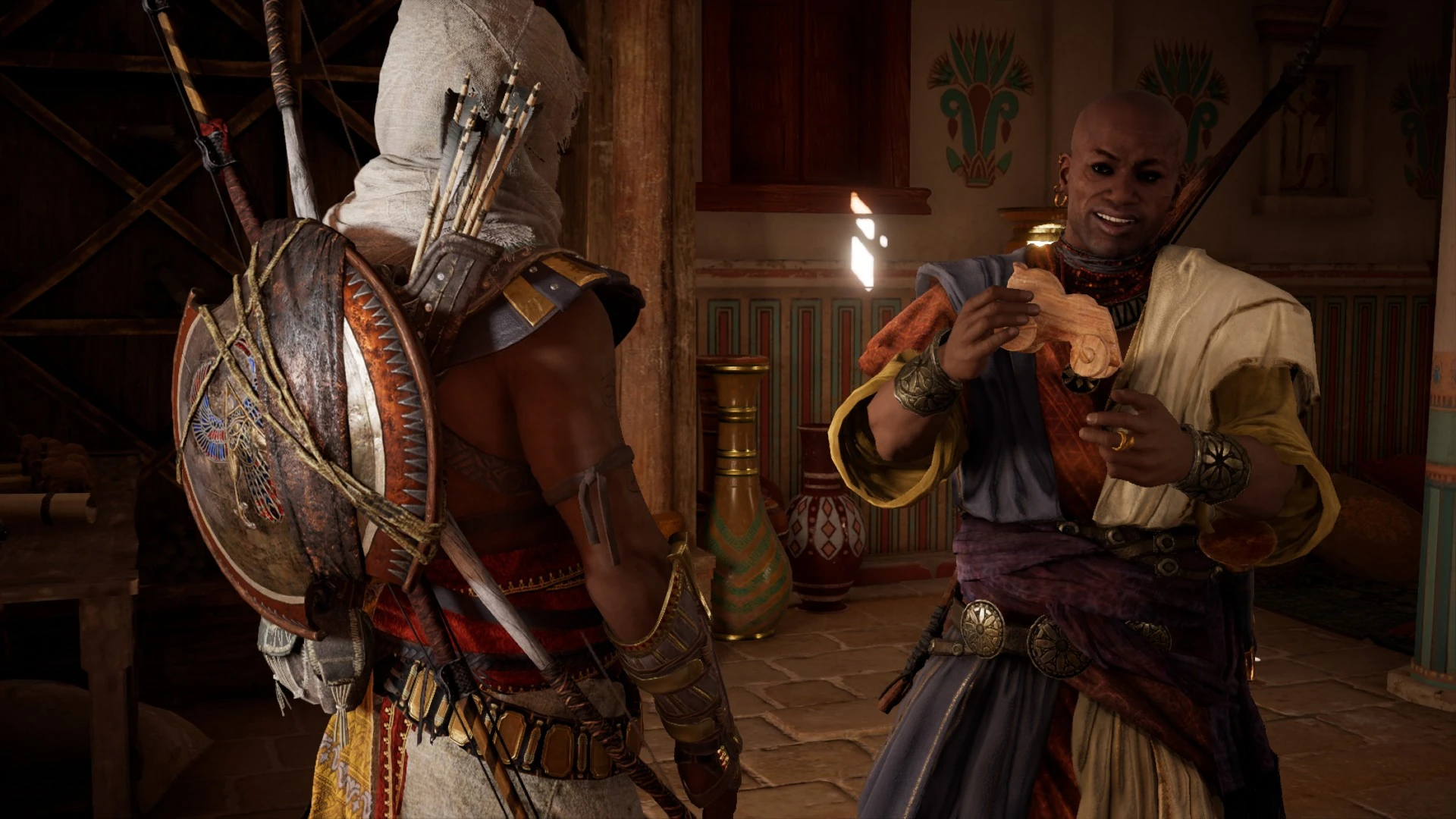 巴耶克抵达亚历山大,前往大图书馆与艾雅碰头。在那里,他遇到了艾雅的表弟法诺斯,法诺斯向巴耶克解释说,由于被通缉,艾雅目前正躲藏着,随后便带巴耶克去了那个藏身处。经过一年的分离,巴耶克终于与妻子重逢了。艾雅向巴耶克展示了一份她从阿克泰翁那里拿到的皇家纸莎草,证明了维序者与托勒密王室有着密切联系,然后将一把袖剑交给了巴耶克,这把剑曾属于波斯守护者大流士,并于公元前465年用于刺杀波斯国王薛西斯一世。[8]在测试了这把袖剑后,巴耶克将它绑在了自己的前臂后侧,[7]却不知大流士实际上是将它绑在前侧的,随后他便出发去揭露"圣蛇"的身份并消灭杰纳迪欧斯。[7]