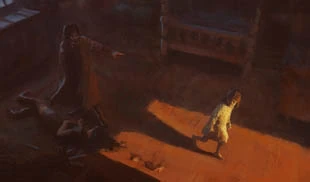 - 人群因惊慌而散开了,卡辛试图乘乱溜走。他失败了!刺客们挡住了他的去路!他拔出了细长的匕首保护自己。他的轻剑进行的反抗只是徒劳的。他用灵活的身手与刺客们保持僵持状态,甚至划开了一人的脸,但他很快倒下了,当四把剑穿透了他的胸后。