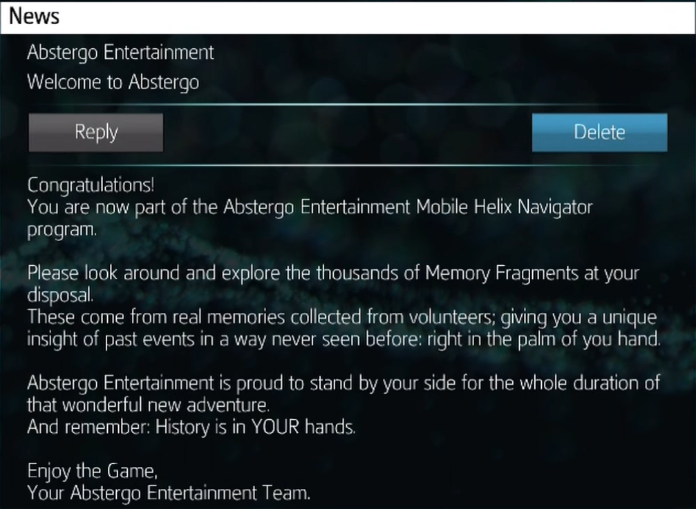 现在您已经是阿布斯泰戈娱乐阿尼穆斯项目的一份子,此项目又称为身份项目。 请随意参观并探索数千片记忆碎片。这些记忆碎片都是从自愿者的真实记忆中收集而来,藉此您可以透过从未曝光的方式,对过去事件有独一无二的了解。只要透过双手,您就能掌握一切。 阿布斯泰戈娱乐公司很荣幸能与您一起全程参予这趟美好的全新冒险。 别忘了:历史就掌握在您的手中。 请好好享受这款游戏,阿布斯泰戈娱乐公司敬上。 | |