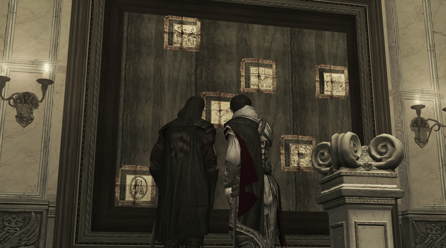 密文书页散落丢失后,刺客曾尝试收集,但是直到1476年只成功定位了6页。就在此年,埃齐奥·奥迪托雷继承了其父亲的使命成为了一名刺客并于1499年集齐了散落在意大利的全部的30页密文。每一页密文都曾被加密,唯一两个能解密的人是埃齐奥已故的父亲,乔瓦尼·奥迪托雷,和埃齐奥的朋友,艺术家,发明家,莱昂纳多·达·芬奇。[1]